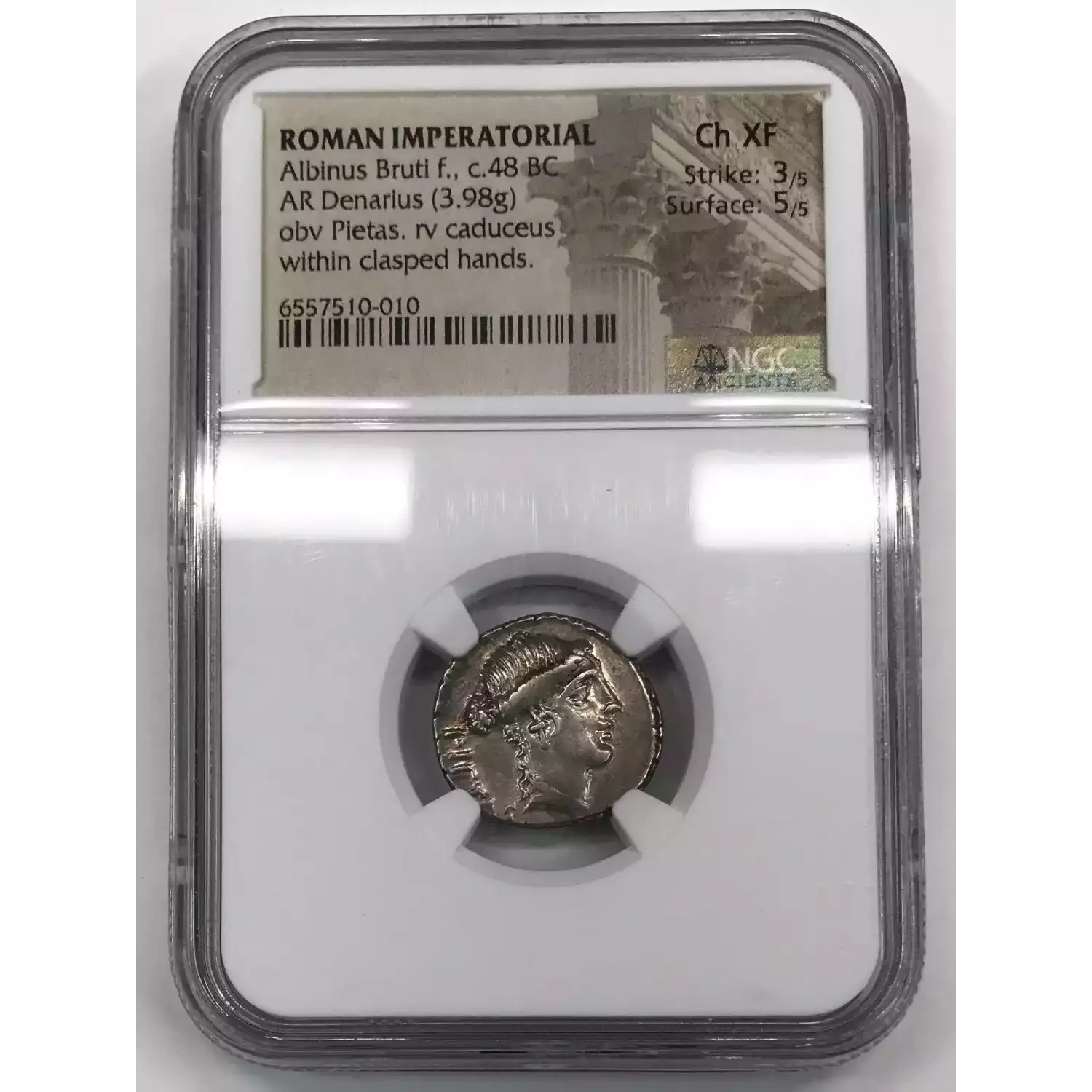 Roman Imperatorial Albinus Bruti f., c.48 BC, AR Denarius, obverse: Pietas, reverse: caduceus within clasped hands, NGC Ancients Ch XF 3 5
