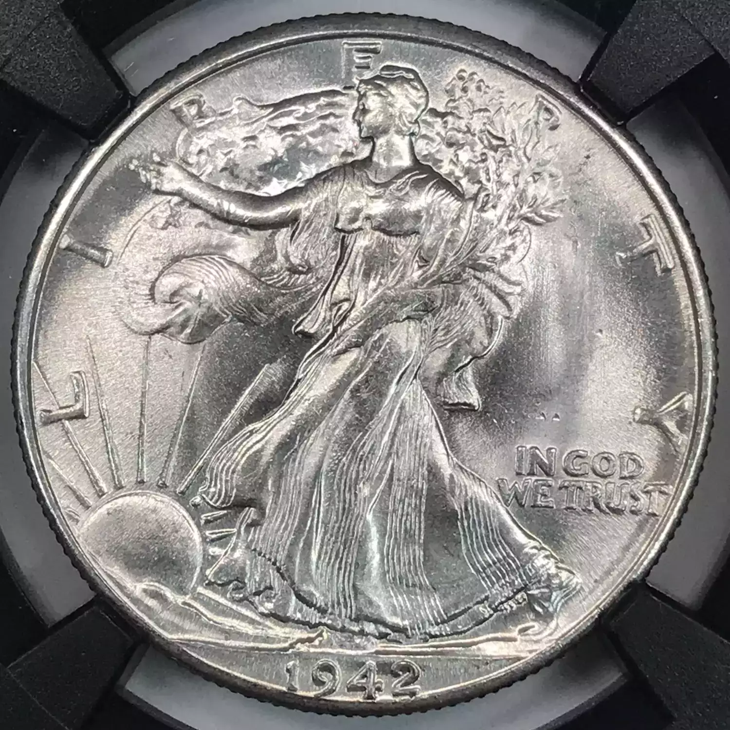 1942 P Walking Liberty Half Dollar NGC MS-64 - Original Bag Fragment Series - minor amount of ink showing on bag fragment