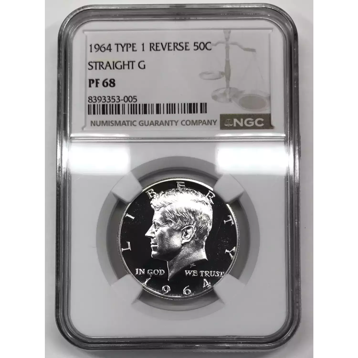 1964 Silver Kennedy Half Dollar NGC PF-68 "STRAIGHT G" TYPE 1 REVERSE
