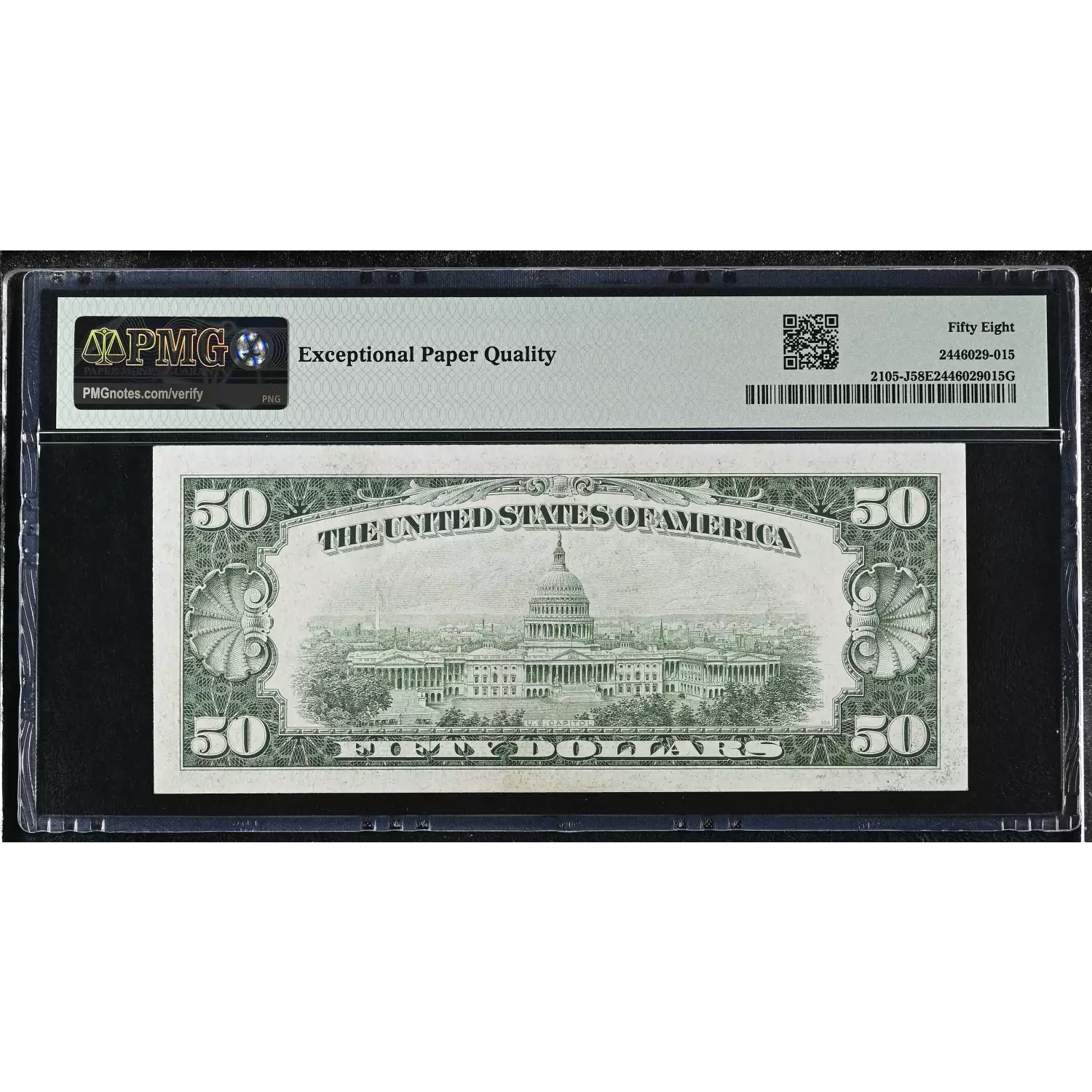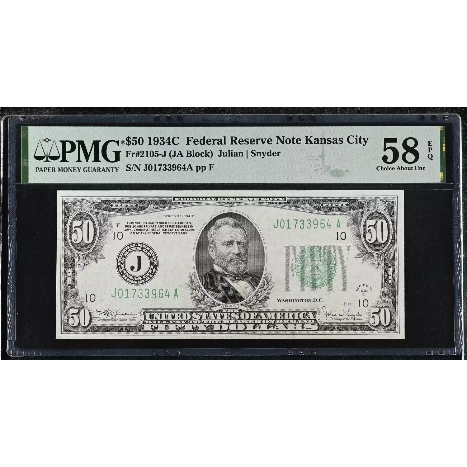 1934C $50 Kansas City Federal Reserve Note (FRN) FR#2105-J PMG AU 58 EPQ