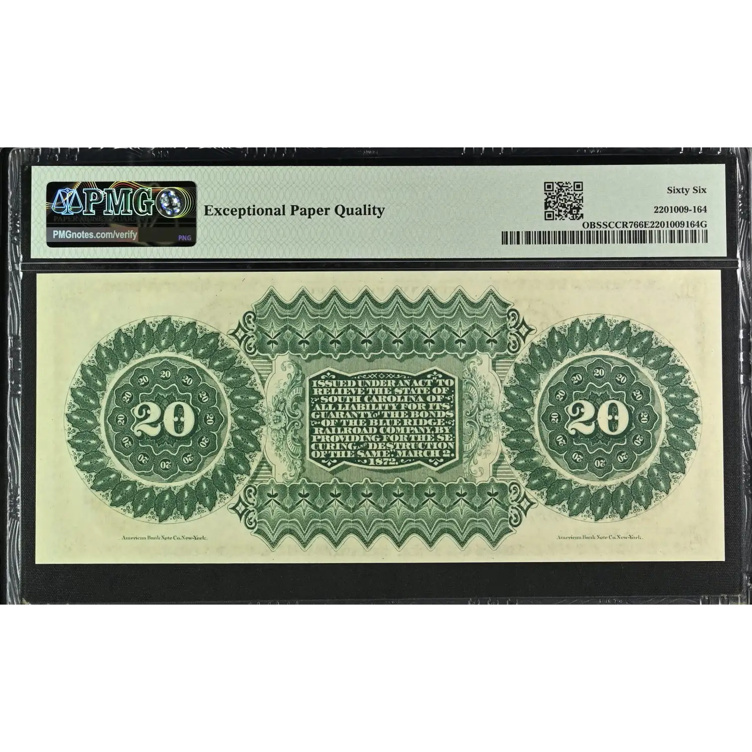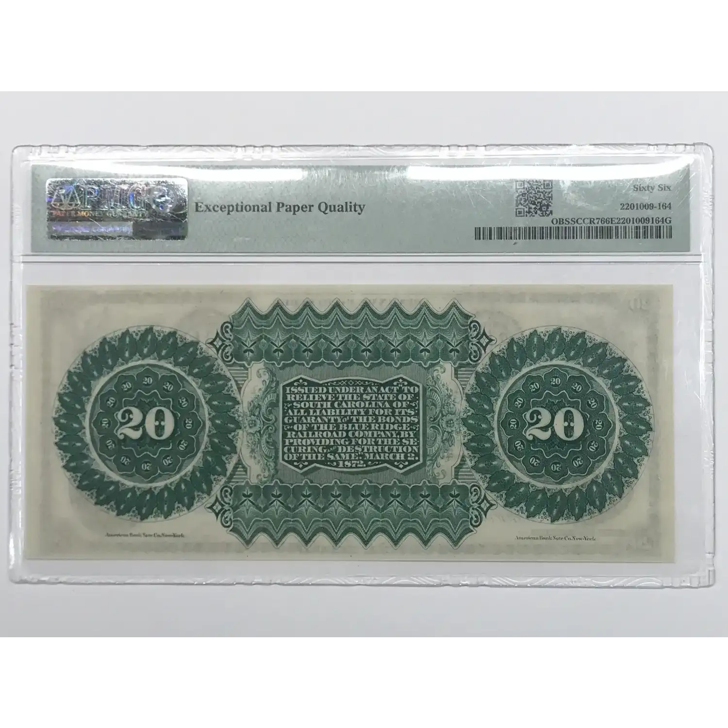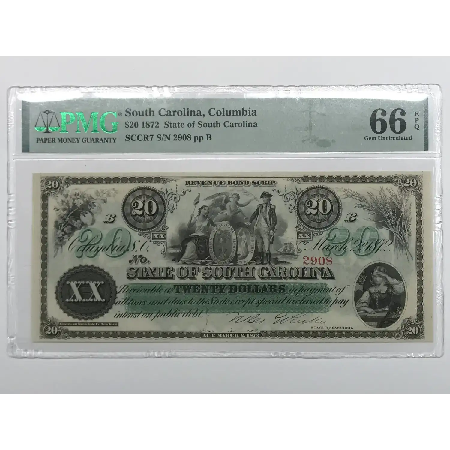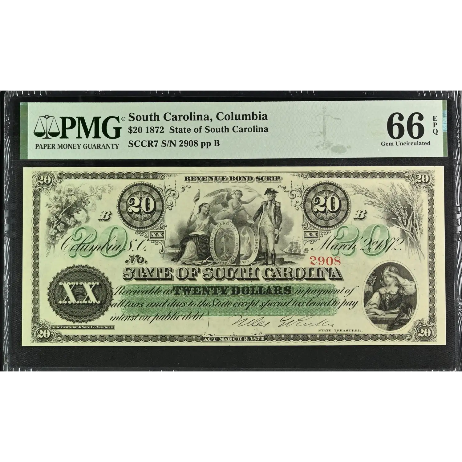 1872 Columbia, State of South Carolina $20 Note PMG 66 EPQ