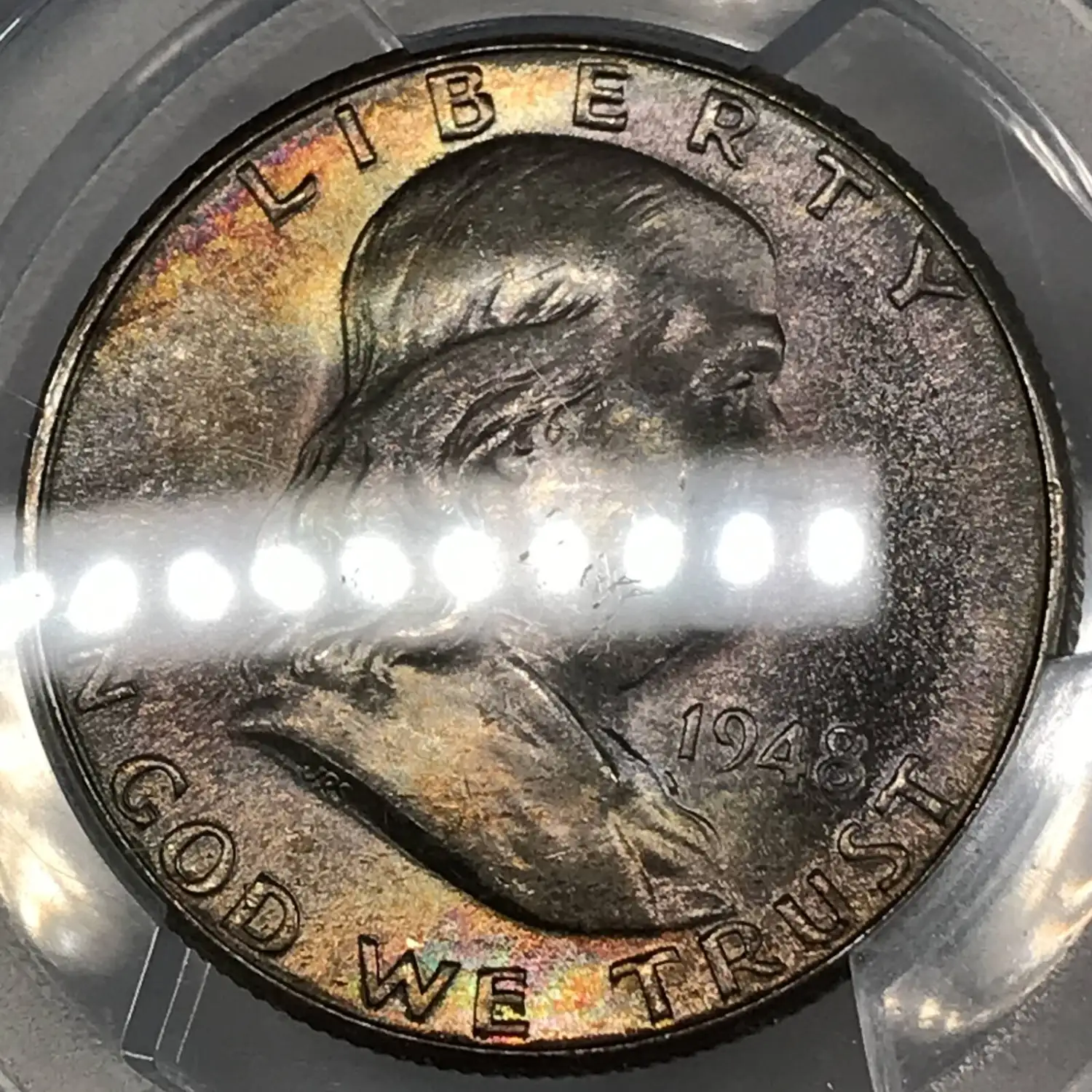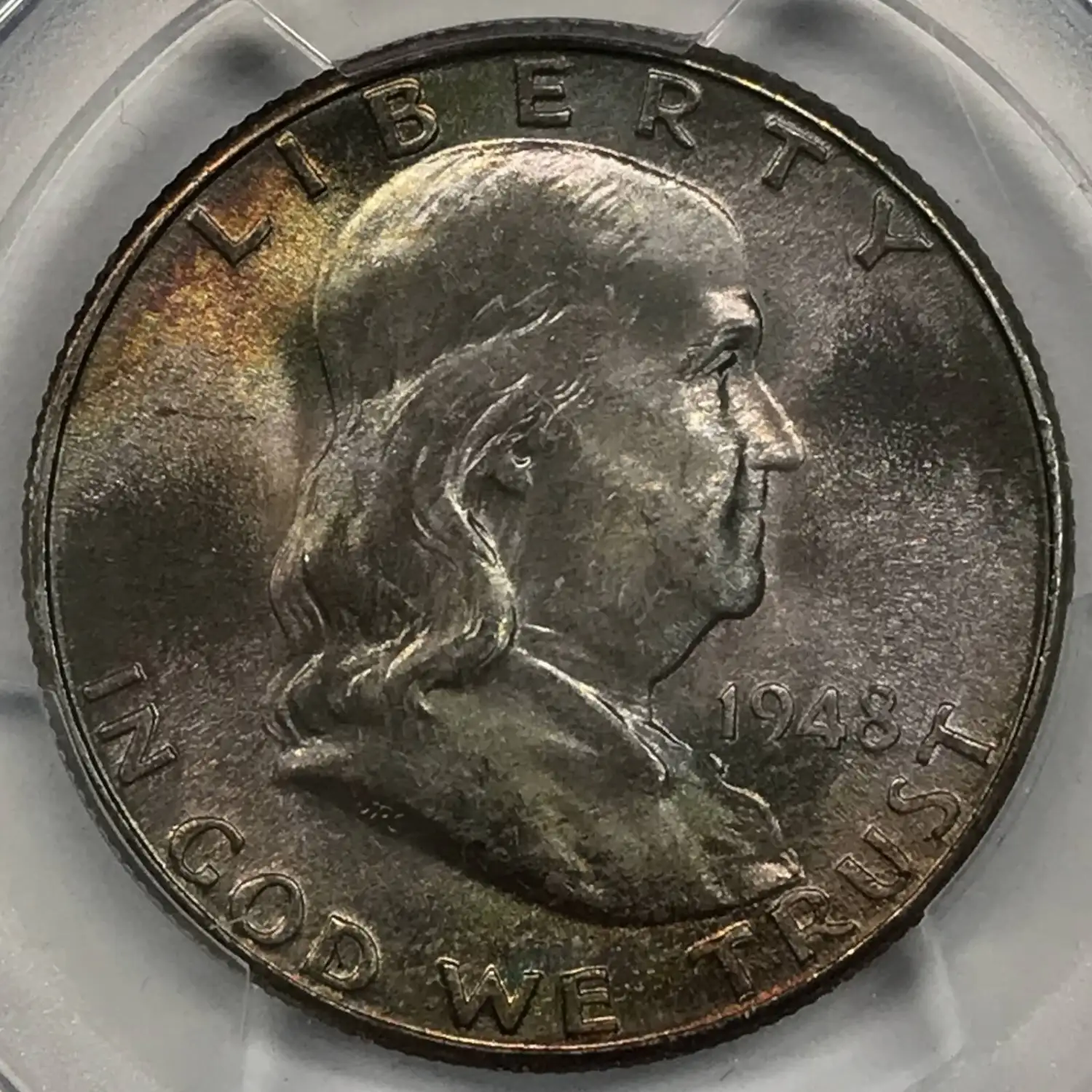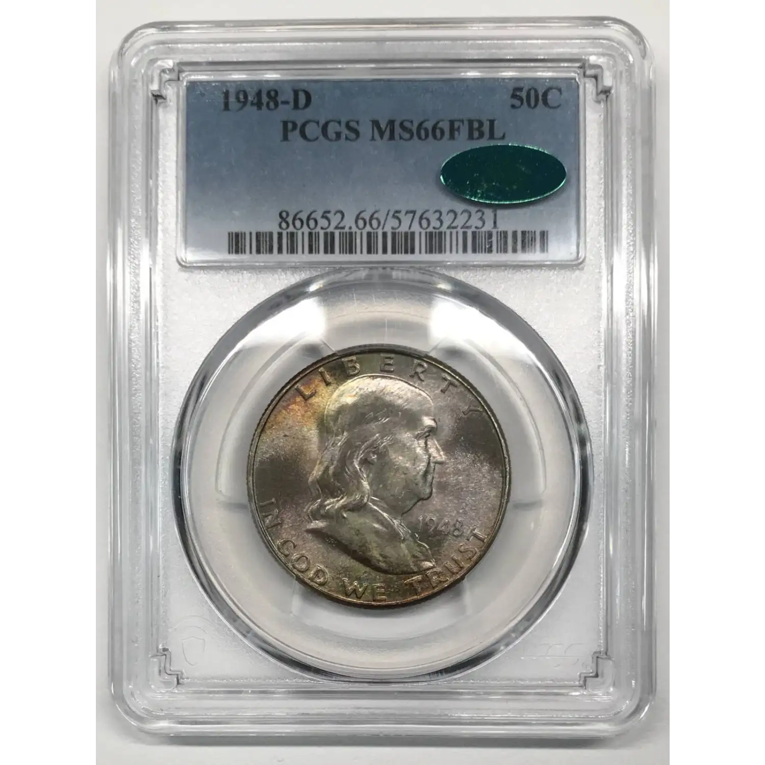 1948‑D Franklin Half Dollar PCGS MS‑66 FBL CAC *Rainbow Toning*