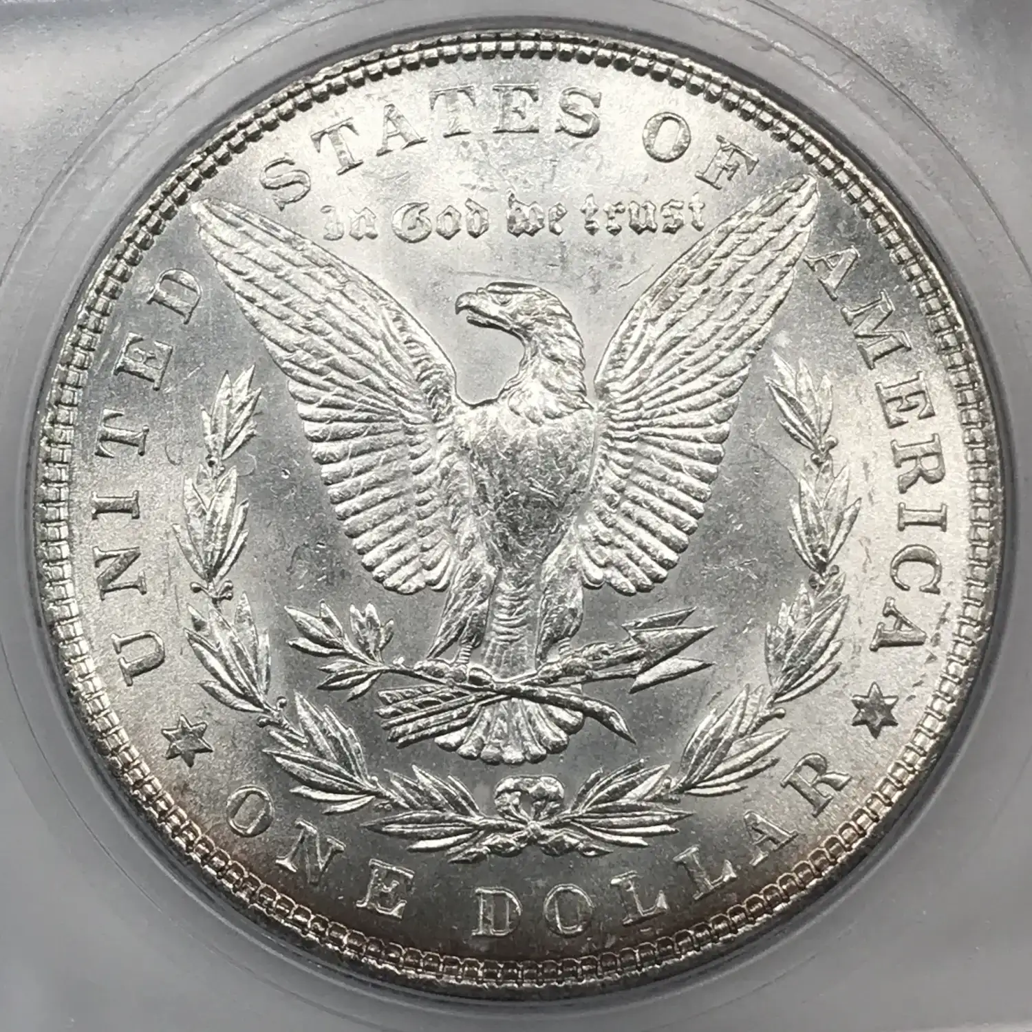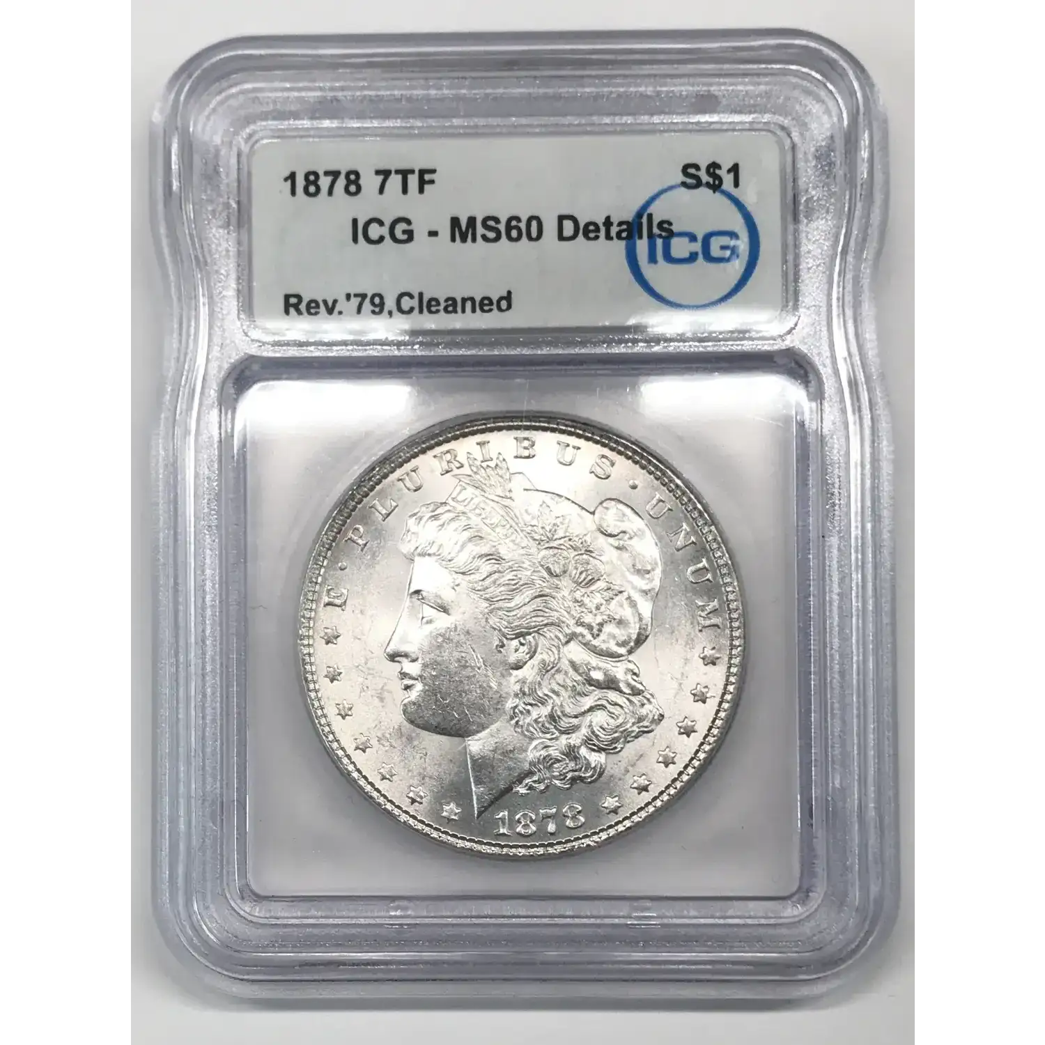 1878 P 7TF, Rev 79 Morgan Silver Dollar ICG MS-60 UNC Details (cleaned) - 7 Tailfeathers, Reverse of 1879