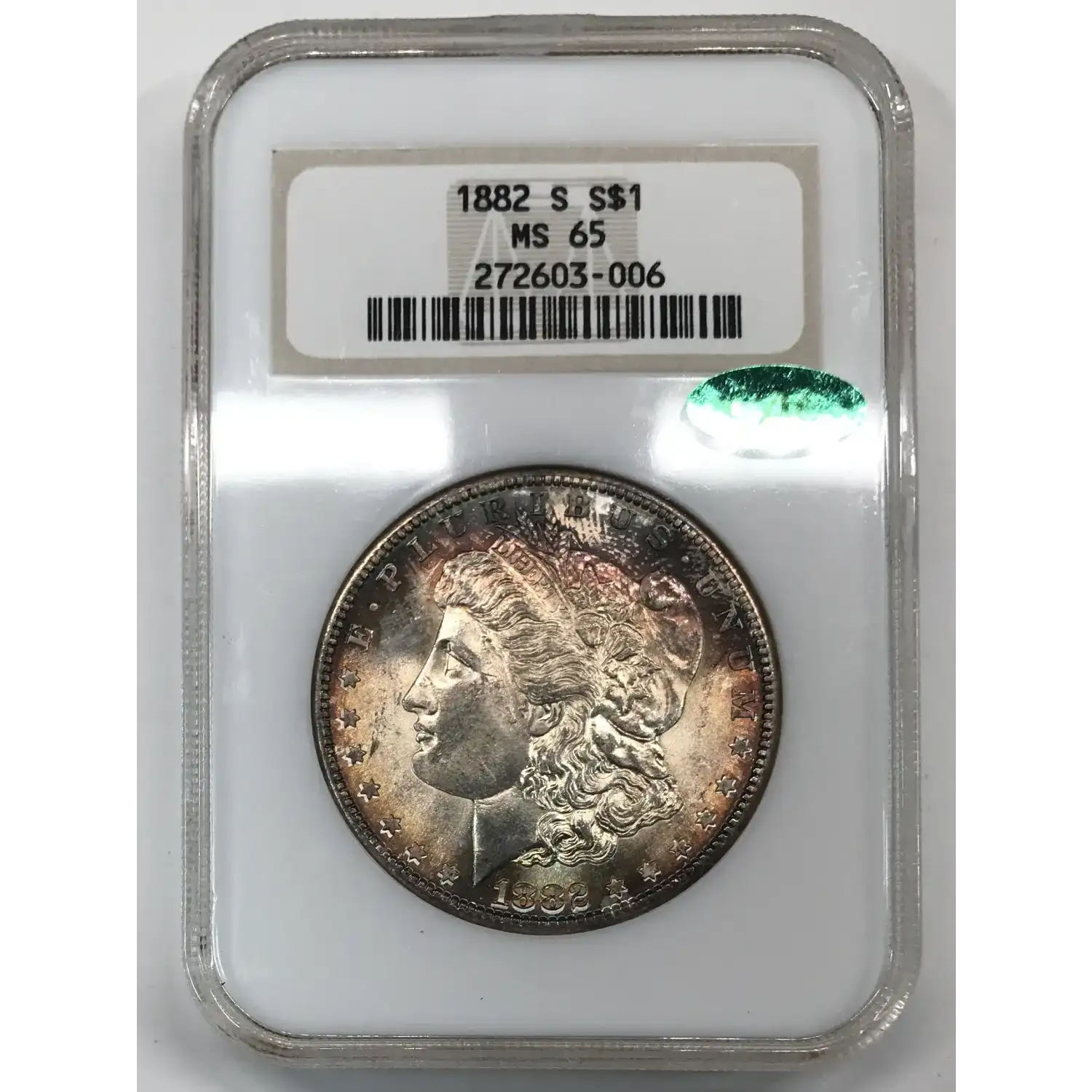 1882‑S Morgan Silver Dollar NGC MS‑65 CAC - Old Fatty Holder - Rainbow Toning