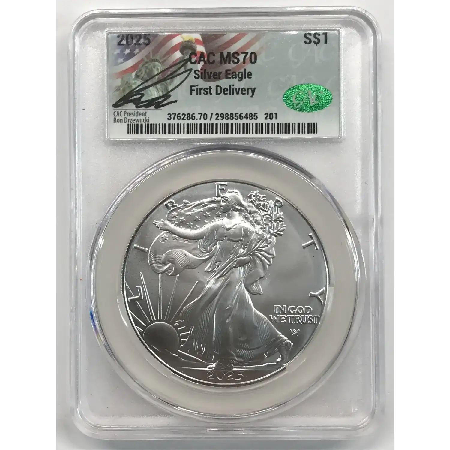 2025 Silver Eagle CAC Grading (CACG) MS 70 First Delivery - Ron Drzewucki Signature Label