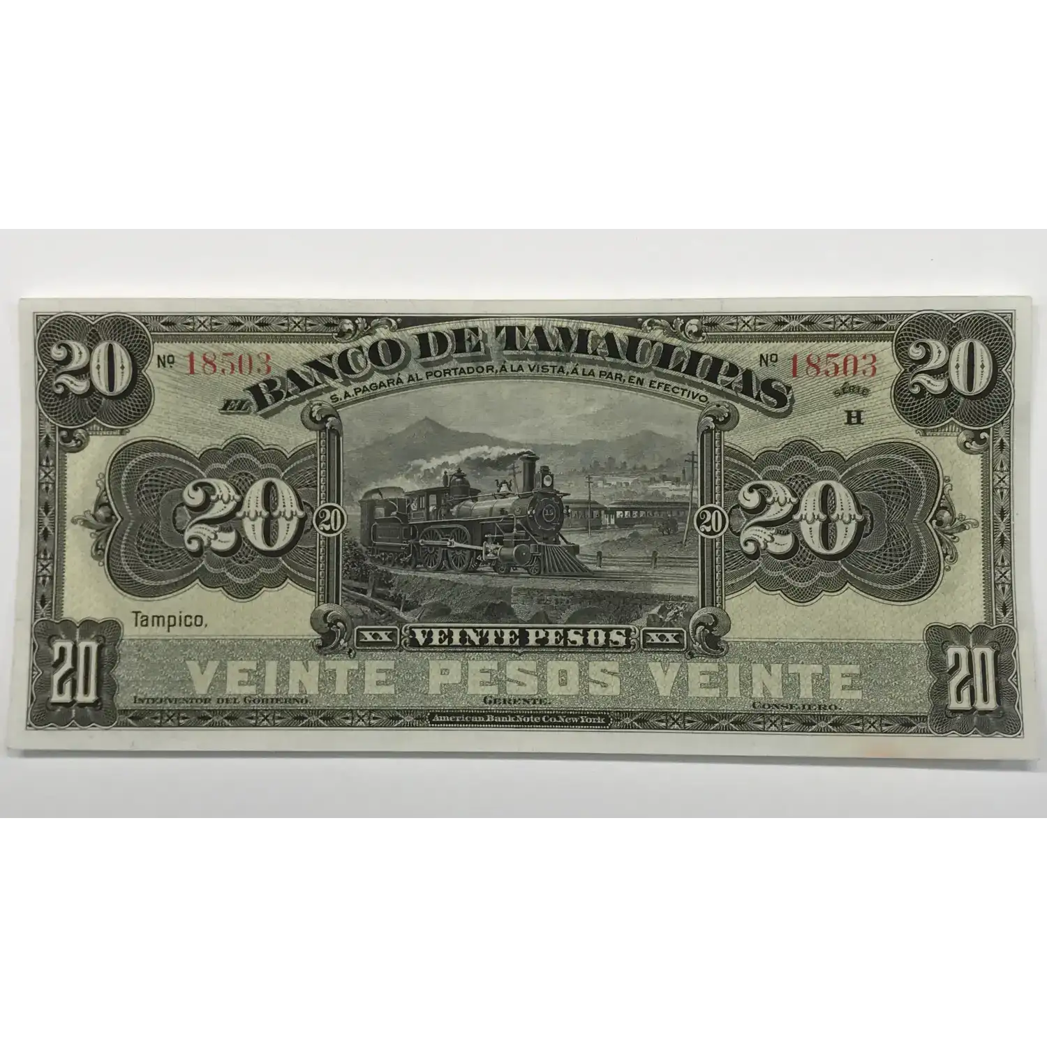 1902-14 Banco de Tamaulipas Mexico 20 Pesos Note ISSUE d. Series H. (ND) (BK-TAM-17) / S431d - CU / Uncirculated - Train Locomotive