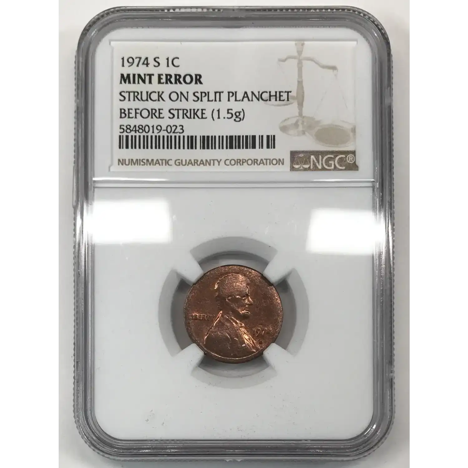 1974-S Lincoln Memorial Cent NGC MINT ERROR STRUCK ON SPLIT PLANCHET BEFORE STRIKE (1.5g)