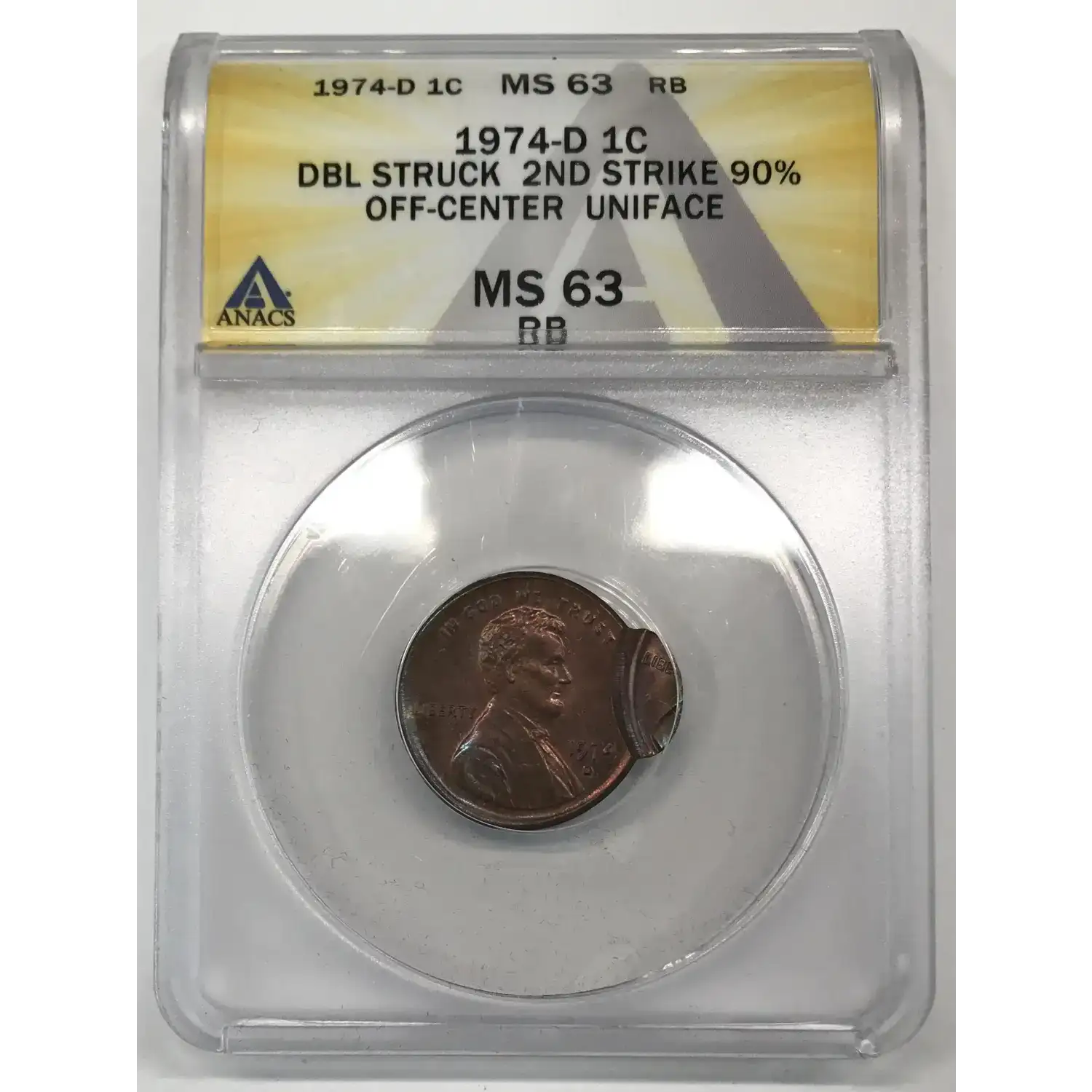 1974-D Lincoln Memorial Cent ANACS MS-63 RB DOUBLE STRUCK 2ND STRIKE 90% OFF CENTER UNIFACE