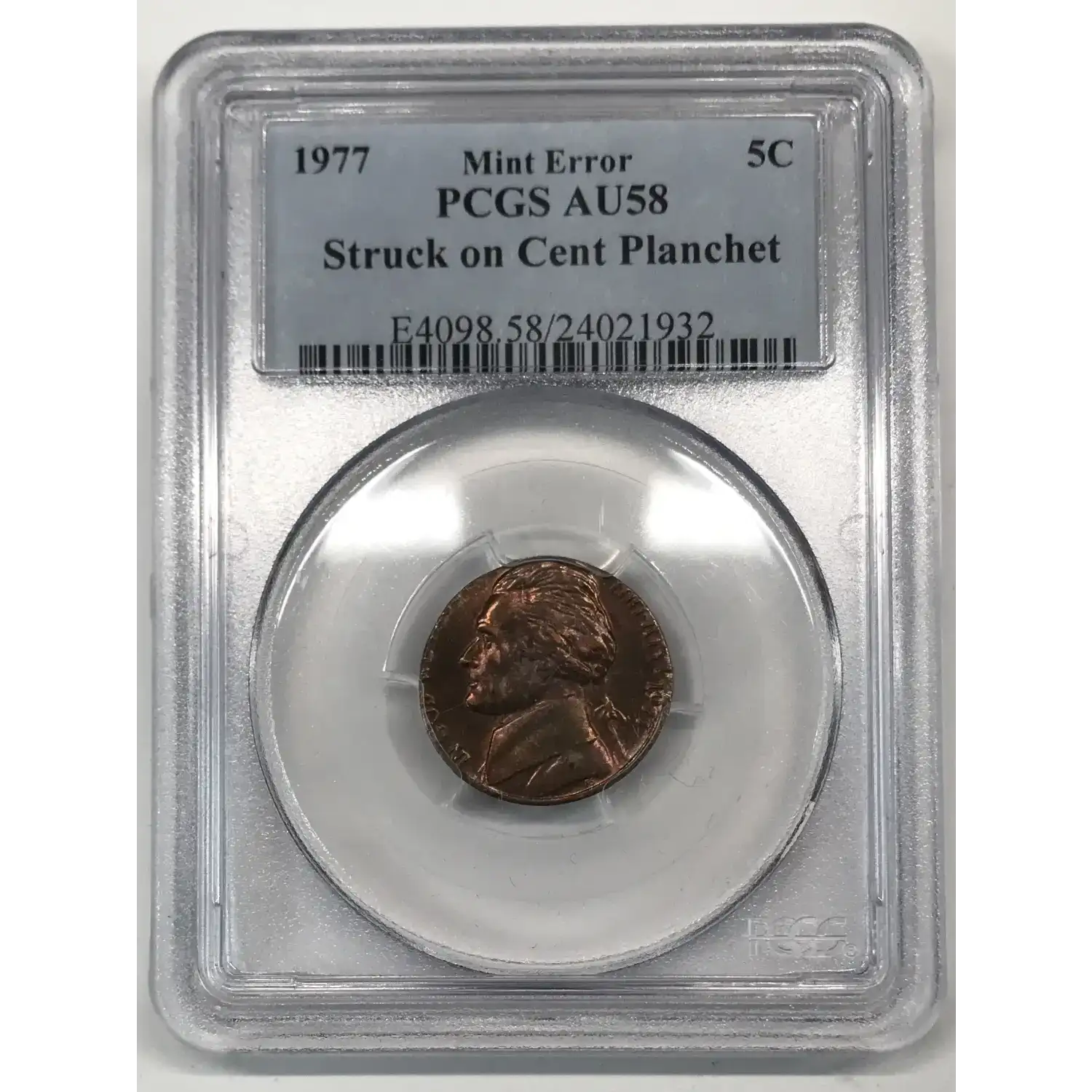 1977 Jefferson Nickel PCGS AU-58 Stuck on 1c Cent Planchet