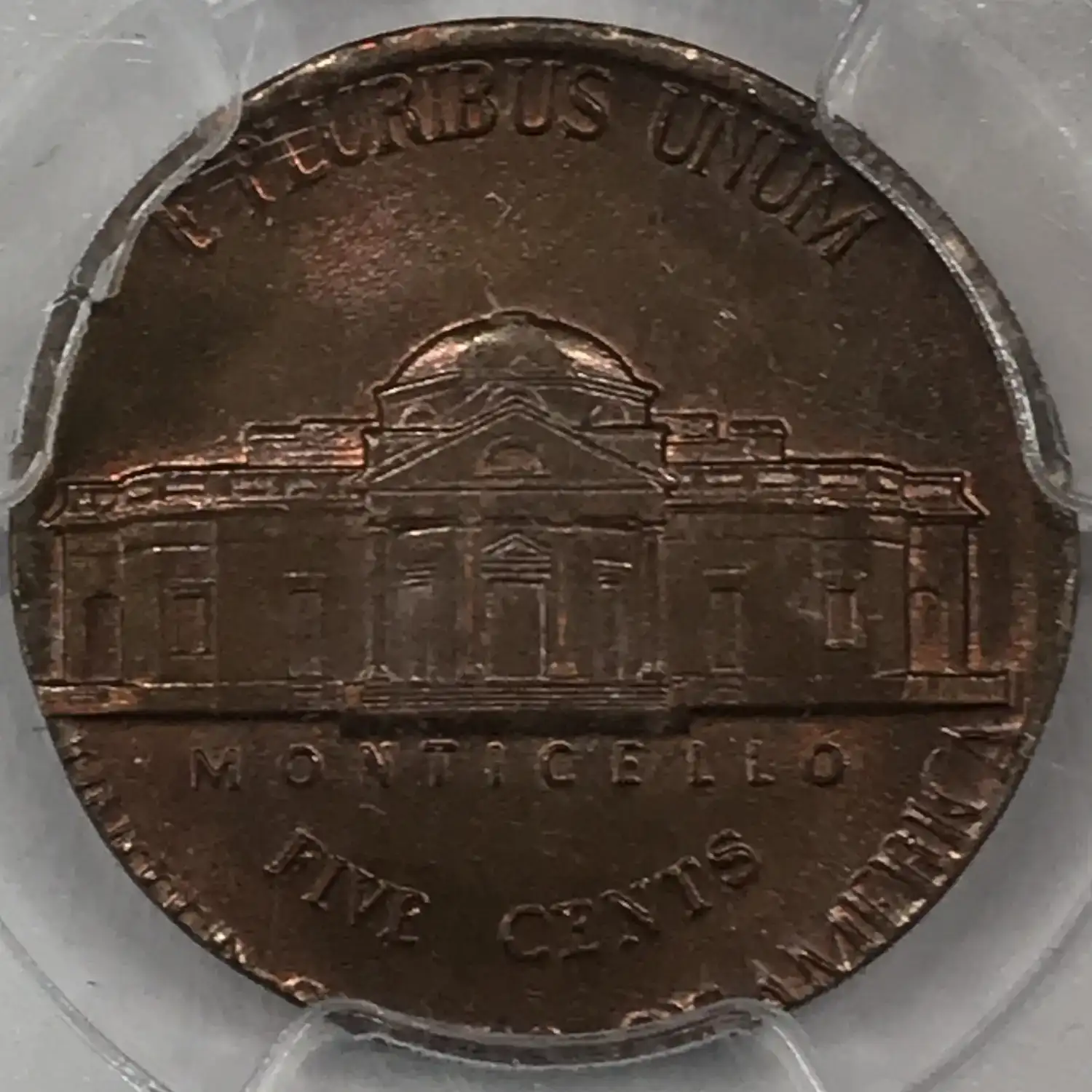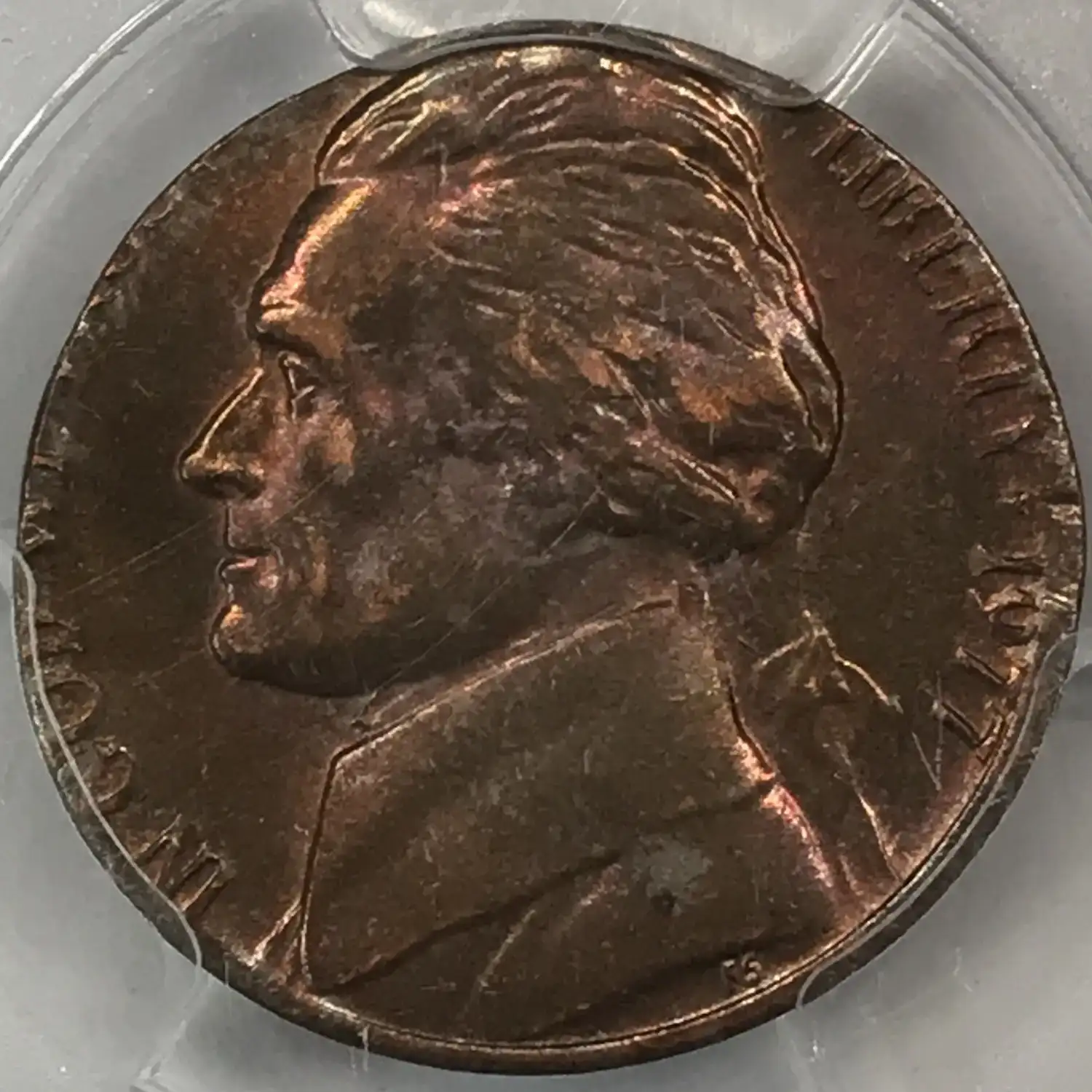 1977 P Jefferson Nickel PCGS AU-58 MINT ERROR Stuck on 1c Cent/Penny Planchet *Rainbow Toning*