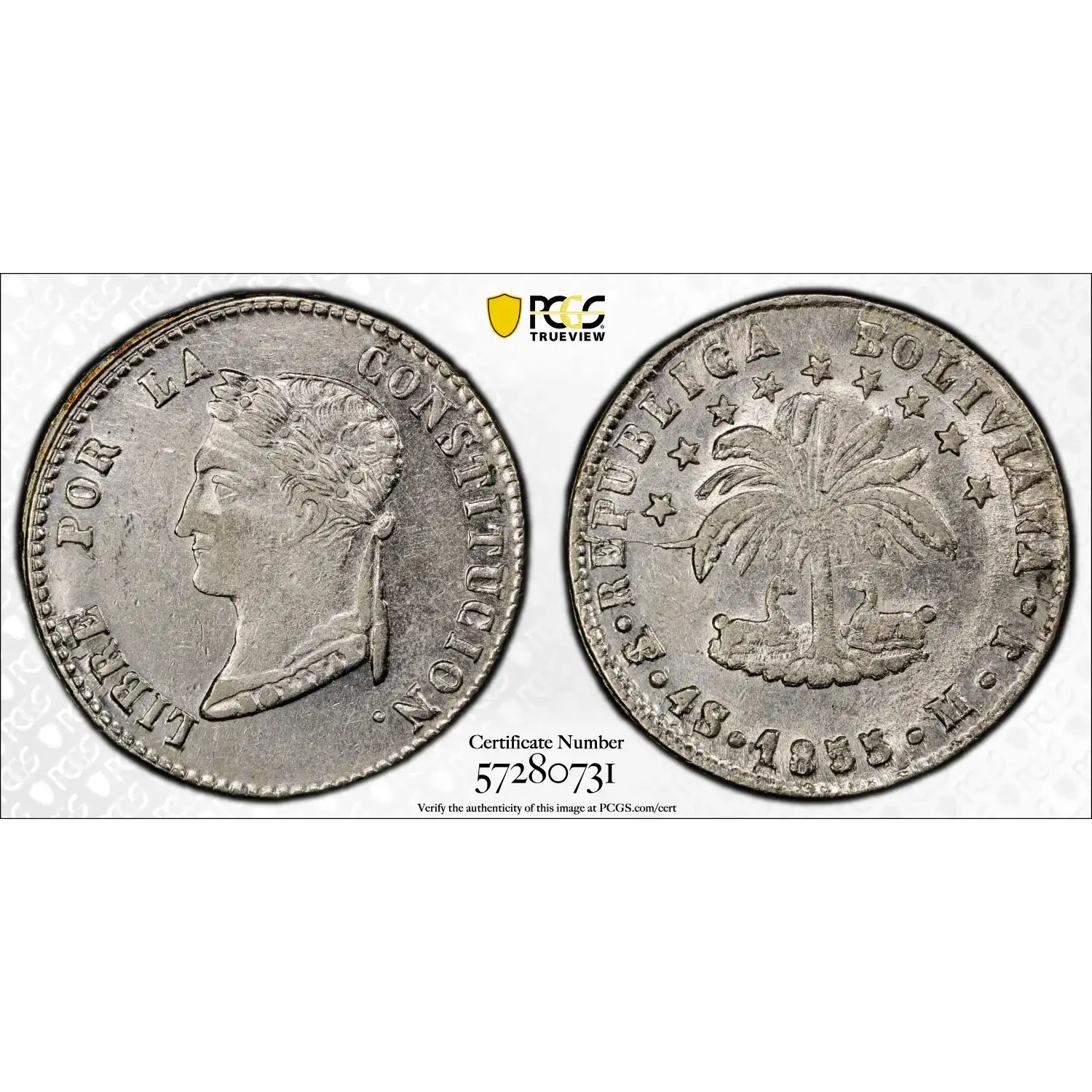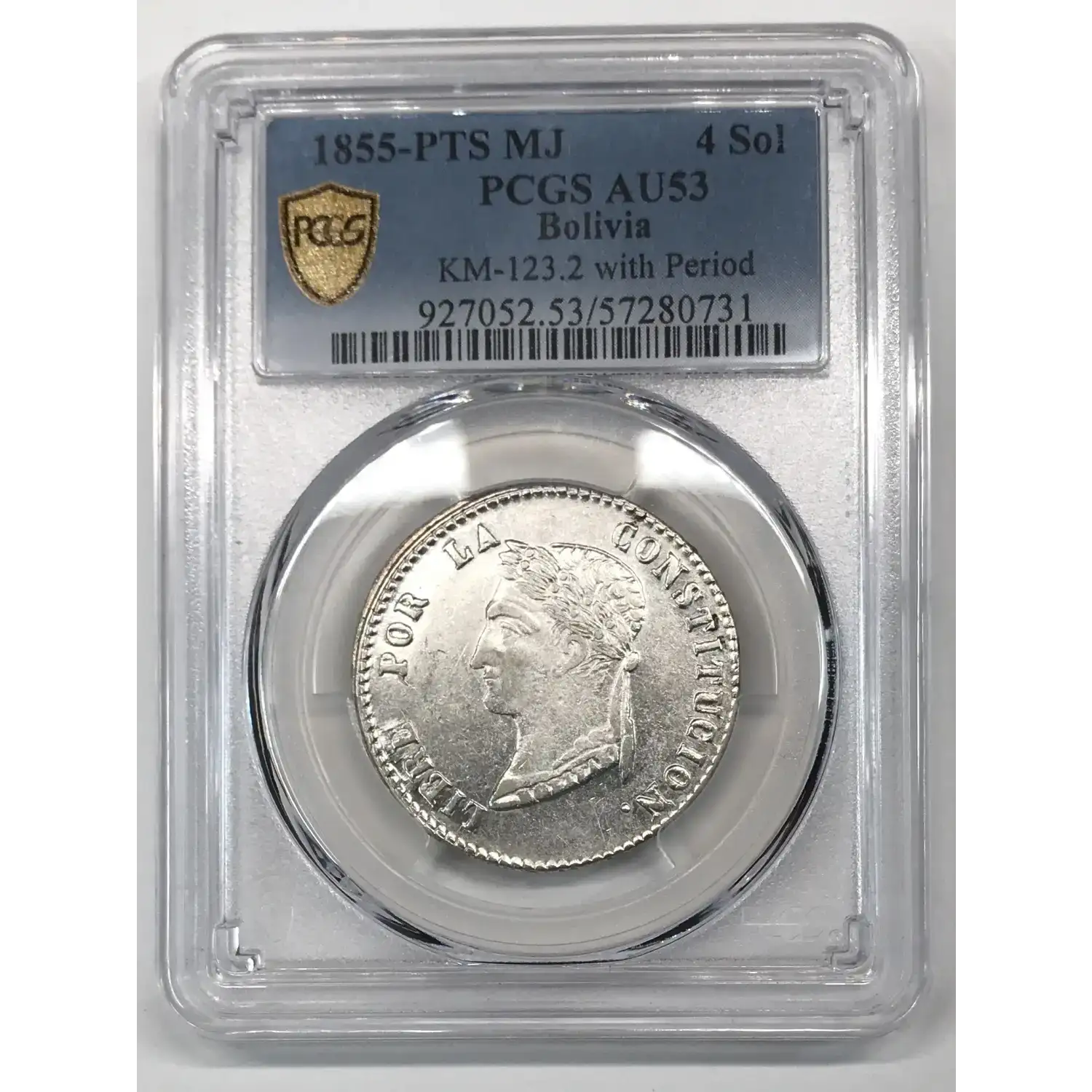 1855 PTS MJ w/ Period Bolivia Silver 4 SOLES PCGS AU-53 - KM-123.2