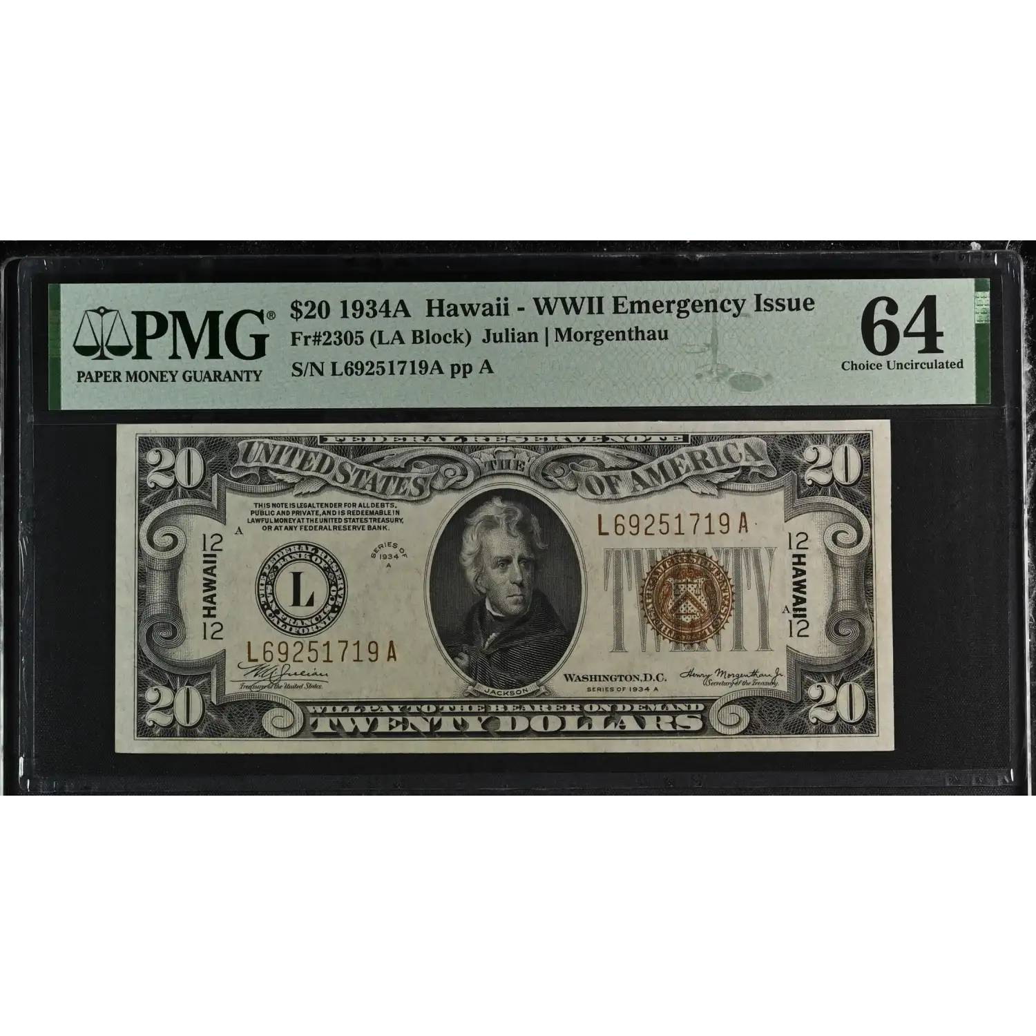 1934A $20 Hawaii WWII Emergency Issue FRN FR#2305 PMG CU 64