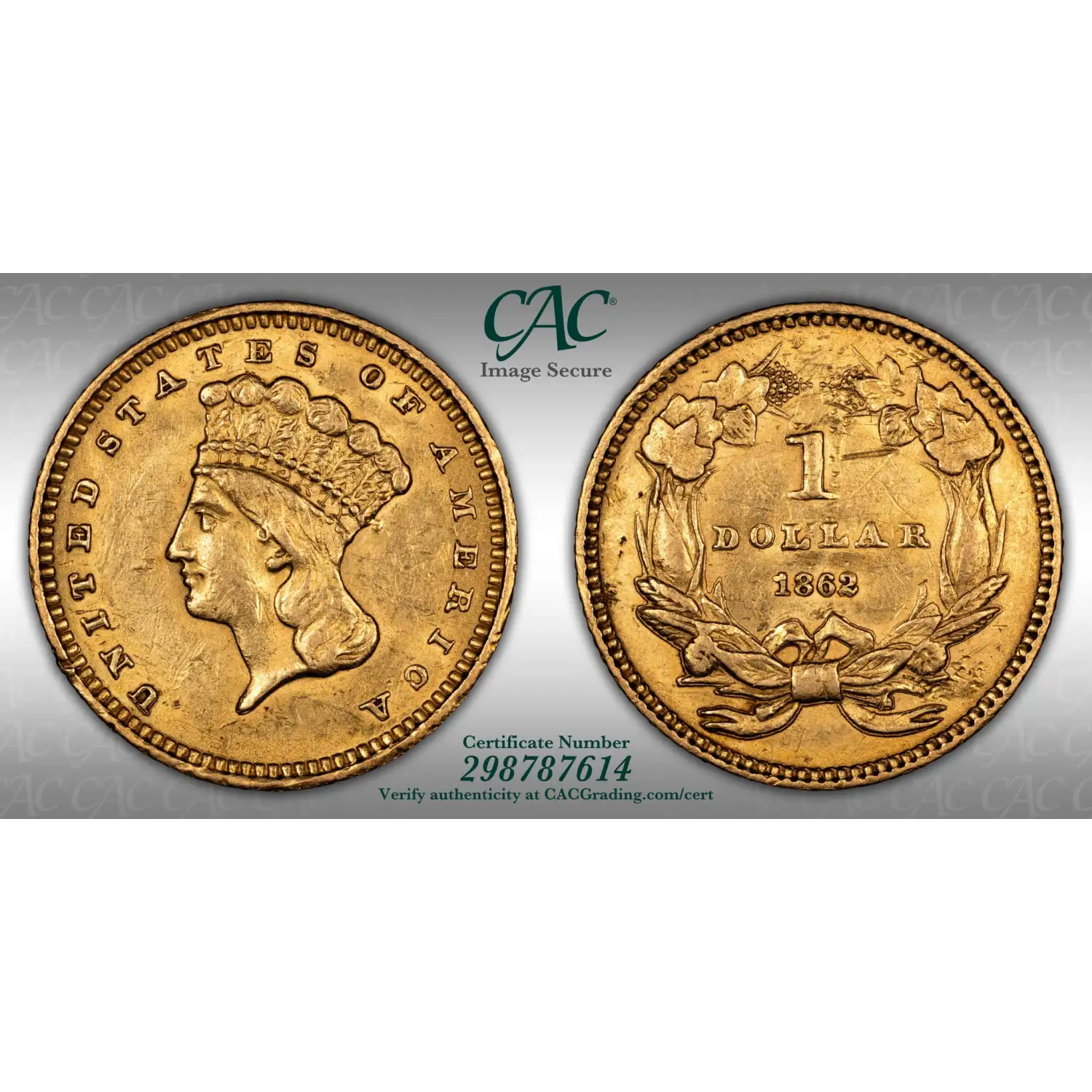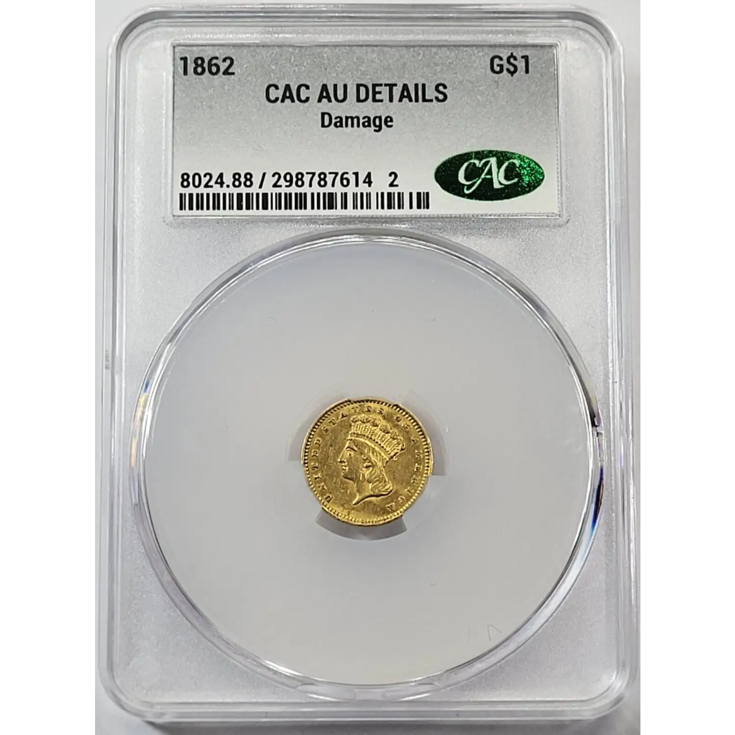 1862 Indian Princess Gold Dollar CACG AU Details Damage CAC