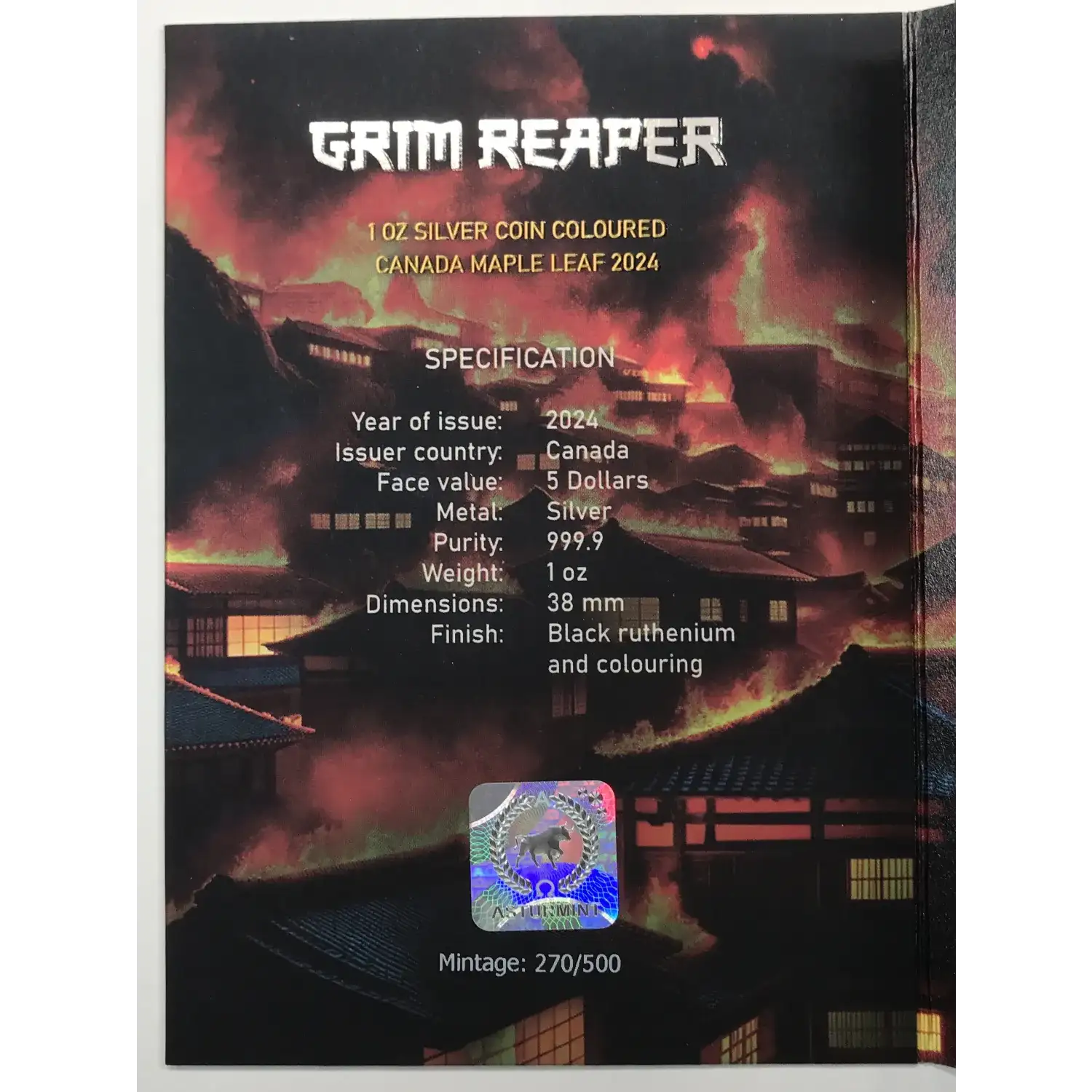 2024 Grim Reaper Samurai Black Ruthenium, Colorized Canada 1 oz Silver Maple Leaf $5 Coin - #270/500 - ASTURMINT
