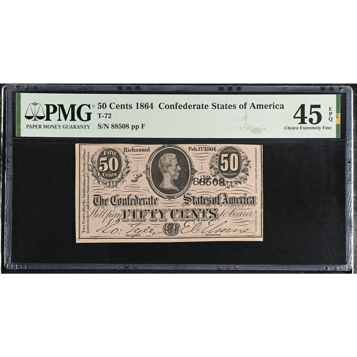 1864 Confederate States of America (CSA) 50 Cents Note T-72 PMG XF 45 EPQ