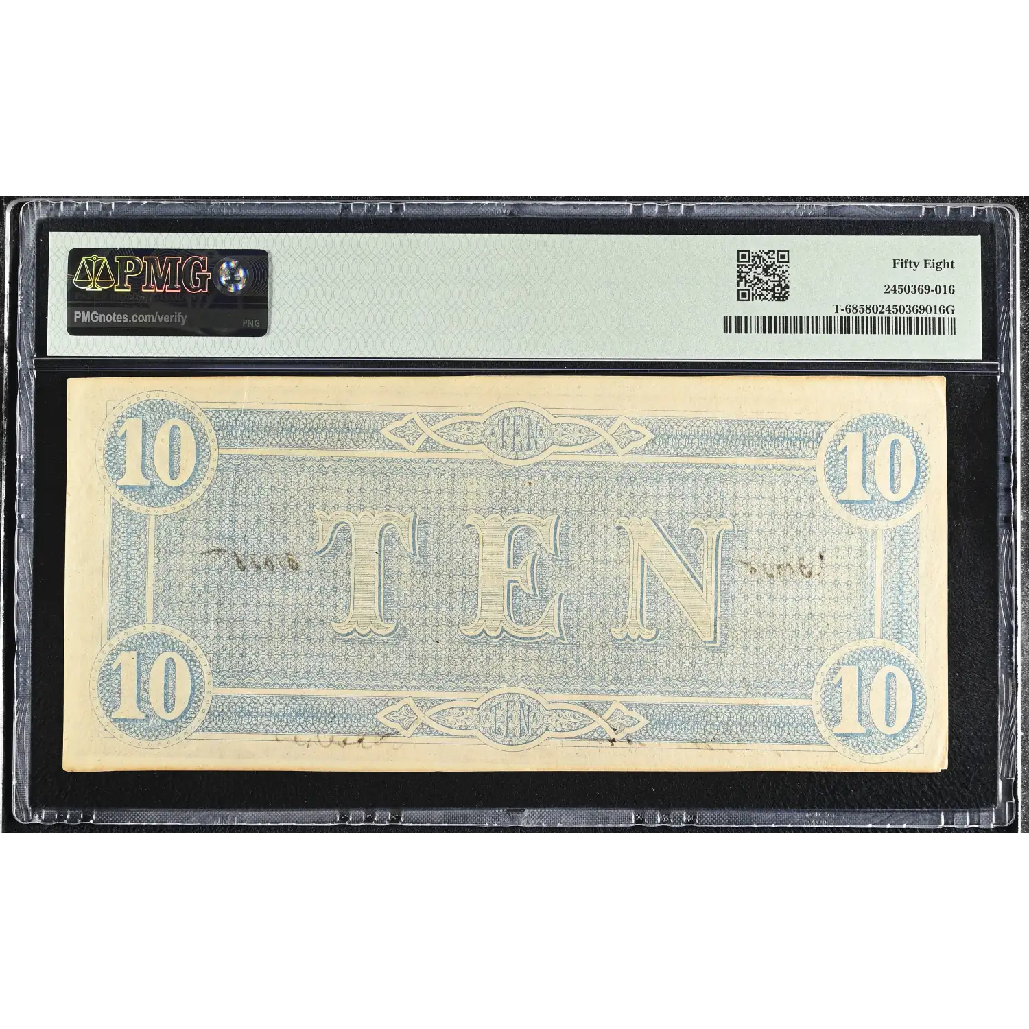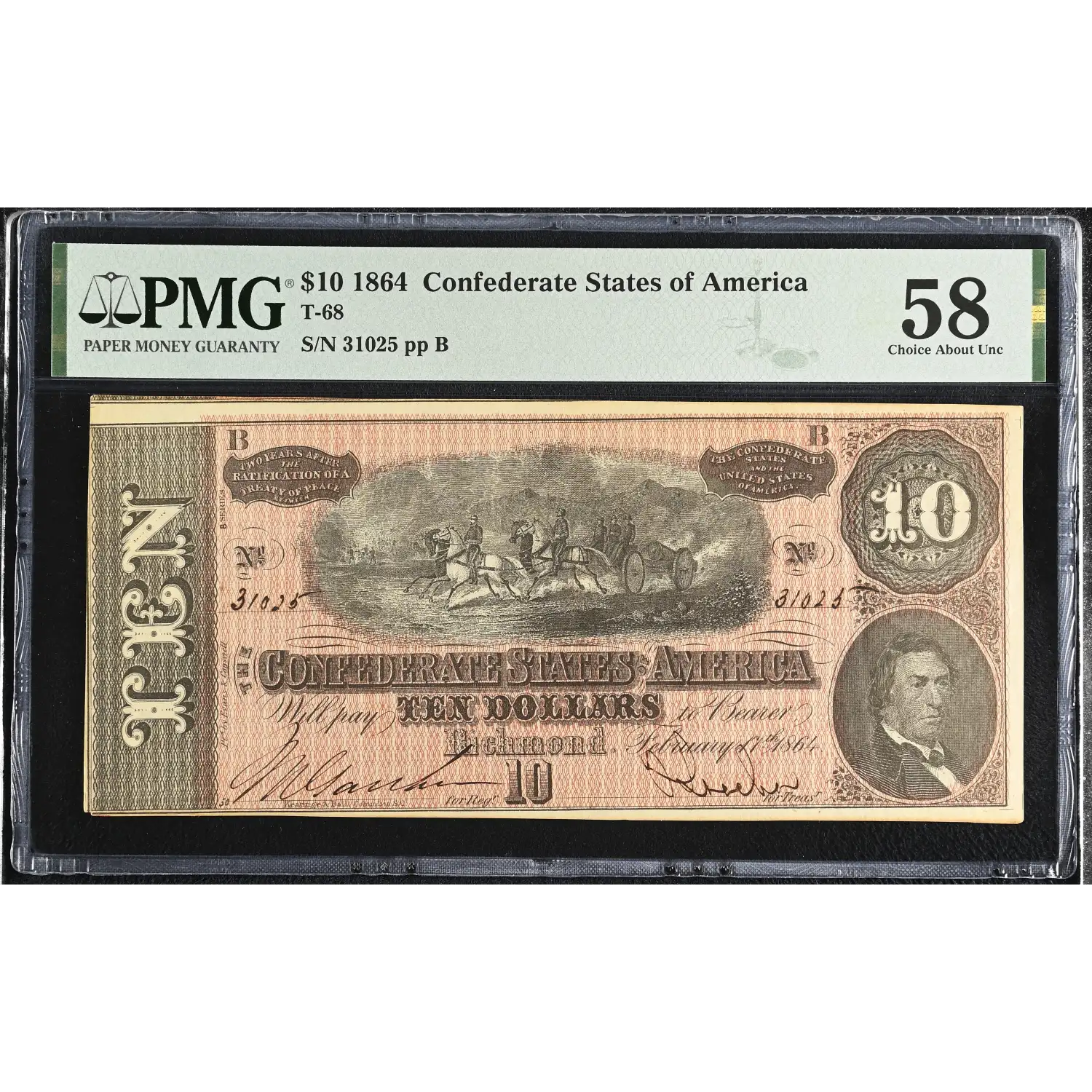 1864 Confederate States of America (CSA) $10 Note T-68 PMG AU 58