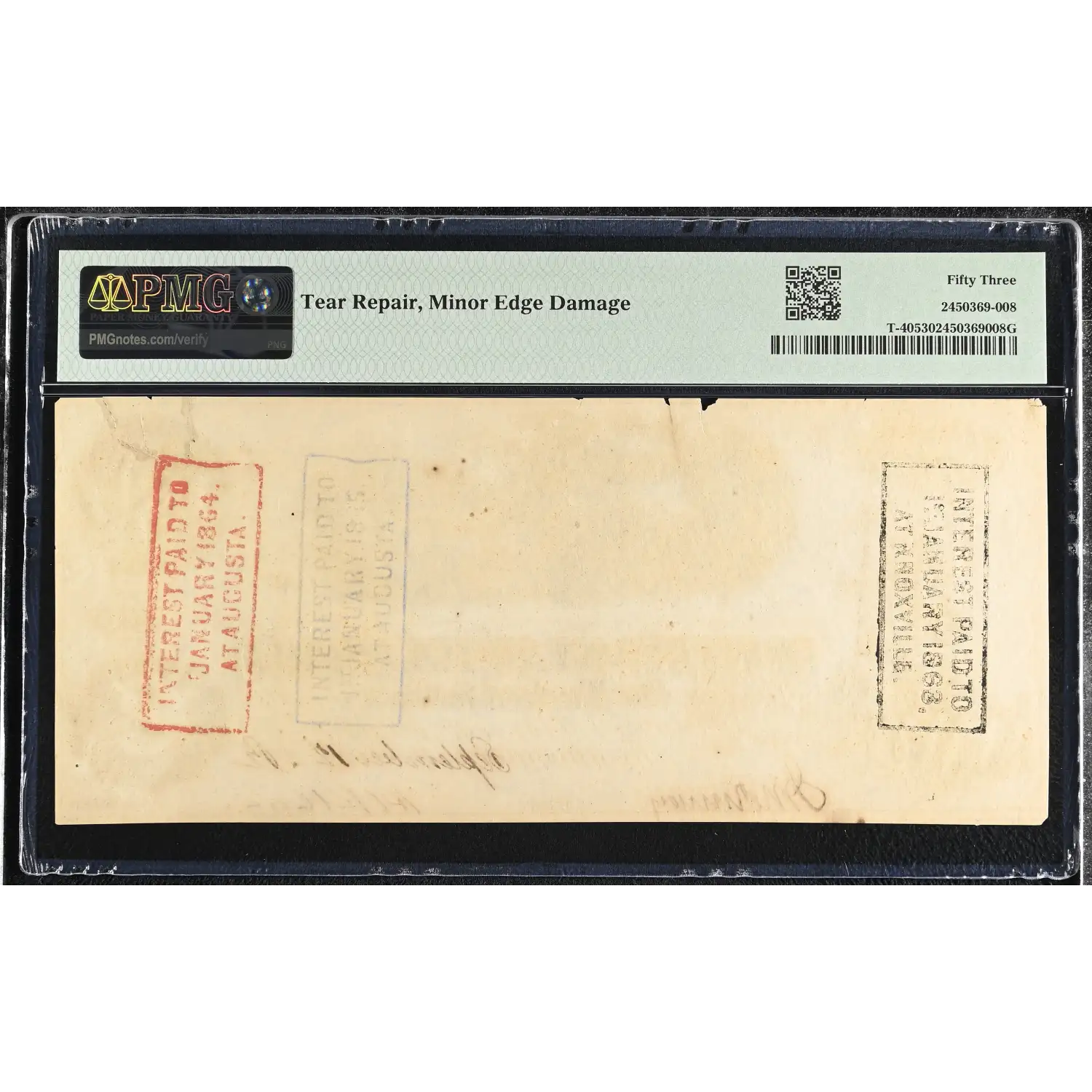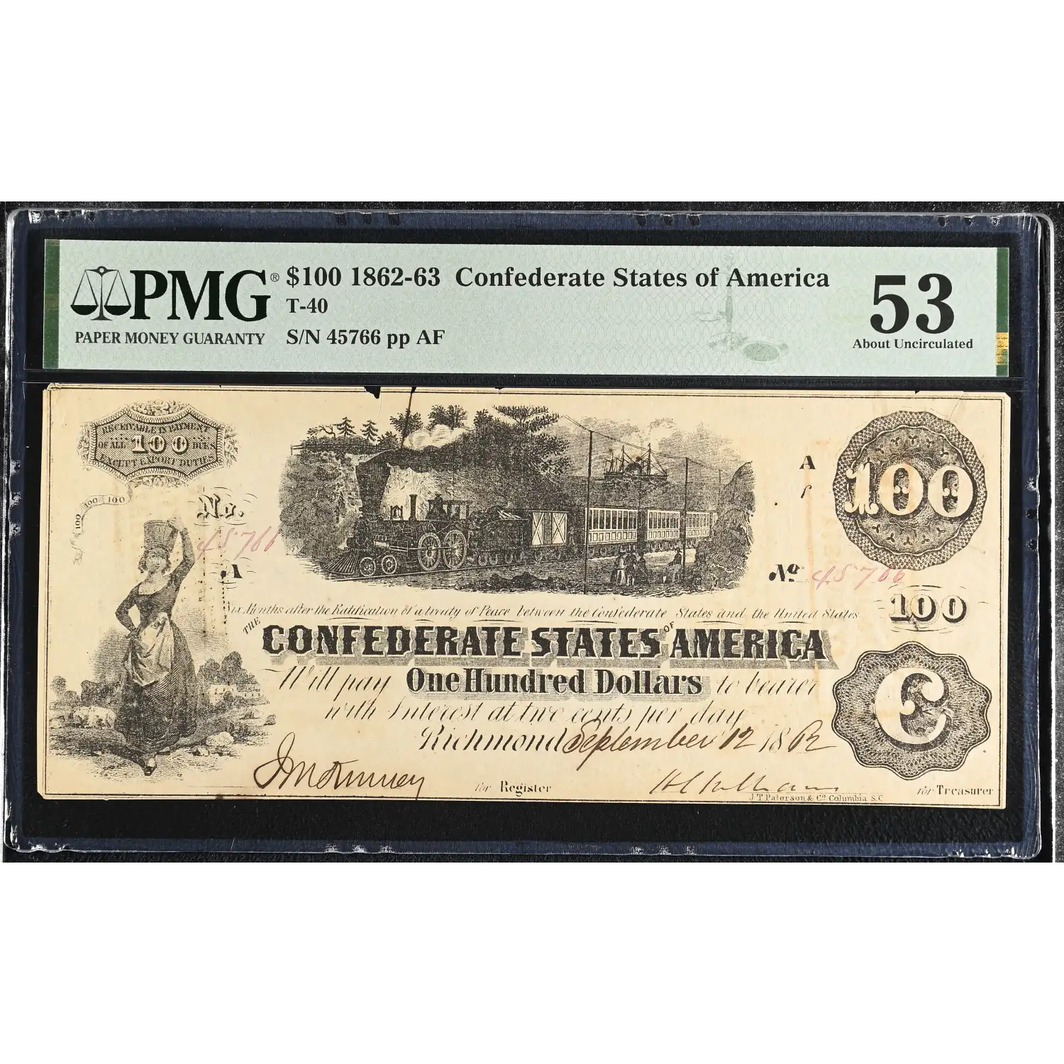 1862-1863 Confederate States of America (CSA) $100 Note T-40 PMG AU 53 (tear repair, minor edge damage) - Interest Paid Knoxville/Augusta