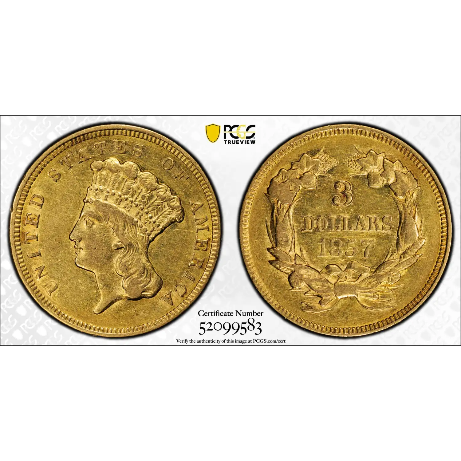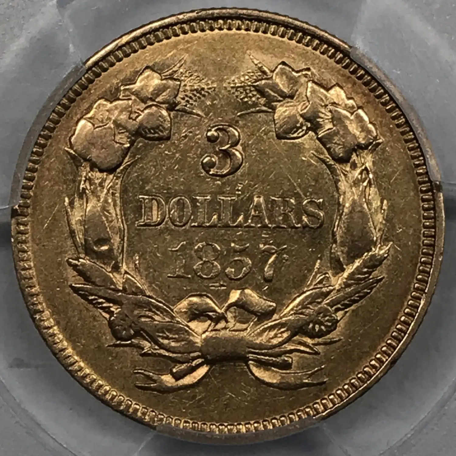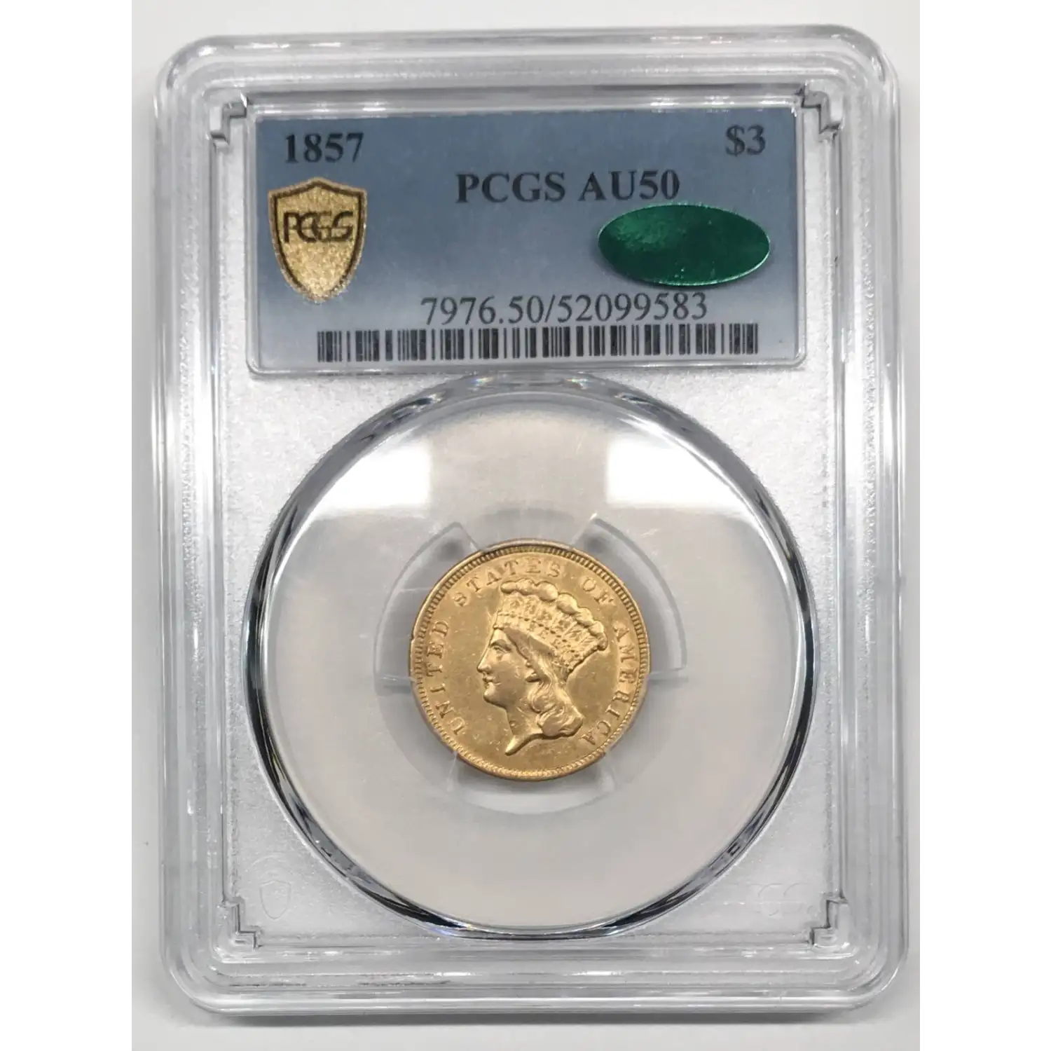 1857 Indian Princess Head $3 Gold Piece PCGS AU-50 CAC