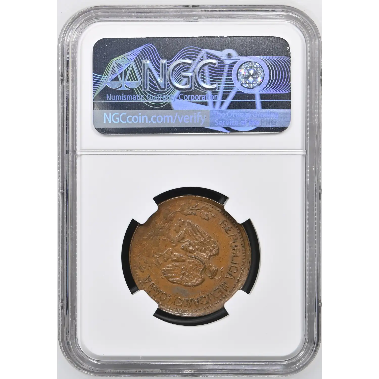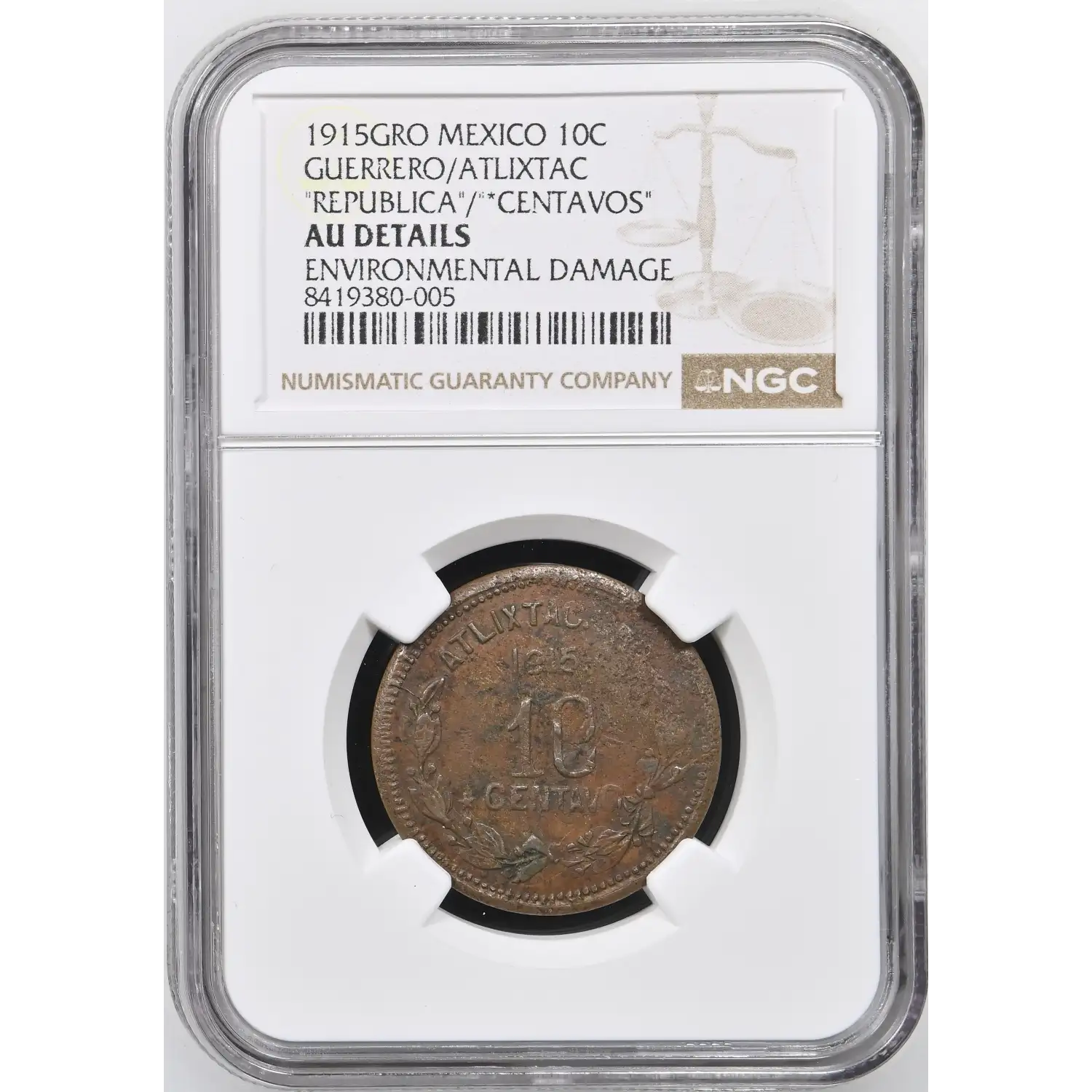 1915-GRO MEXICO-REVOLUTIONARY Copper 10 CENTAVOS NGC AU Details BN GUERRERO/ATLIXTAC - Over Strike
