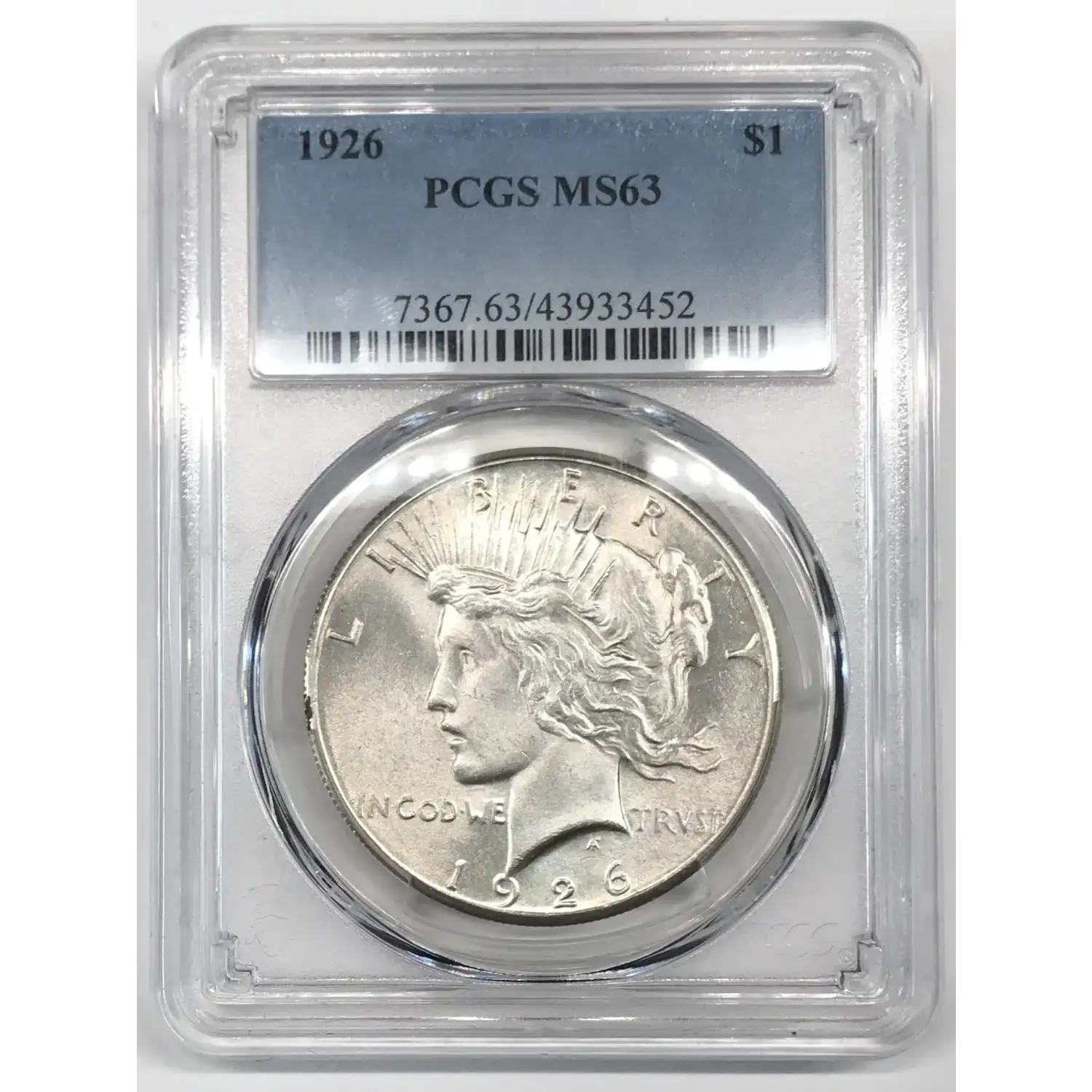 1926 P Peace Silver Dollar PCGS MS-63 - TOP 50 VAM-2 Doubled Die Reverse (DDR) Leaves - coin has threadlike impression die marker for Die 2 Obverse - note that variety is not attributed on the label