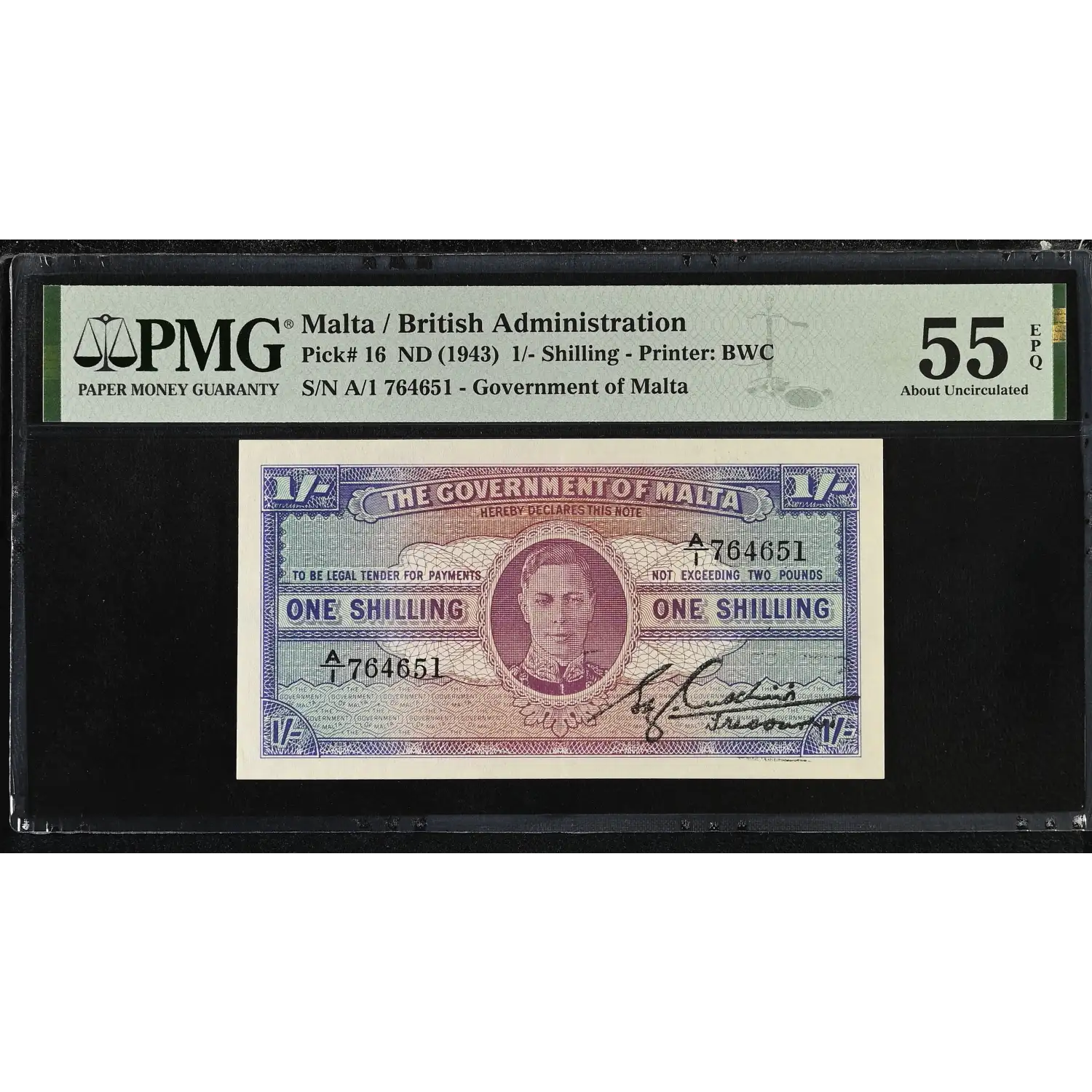 1943 (ND) Malta / British Admin. 1 Shilling Pick 16 - 55 About Uncirculated EPQ