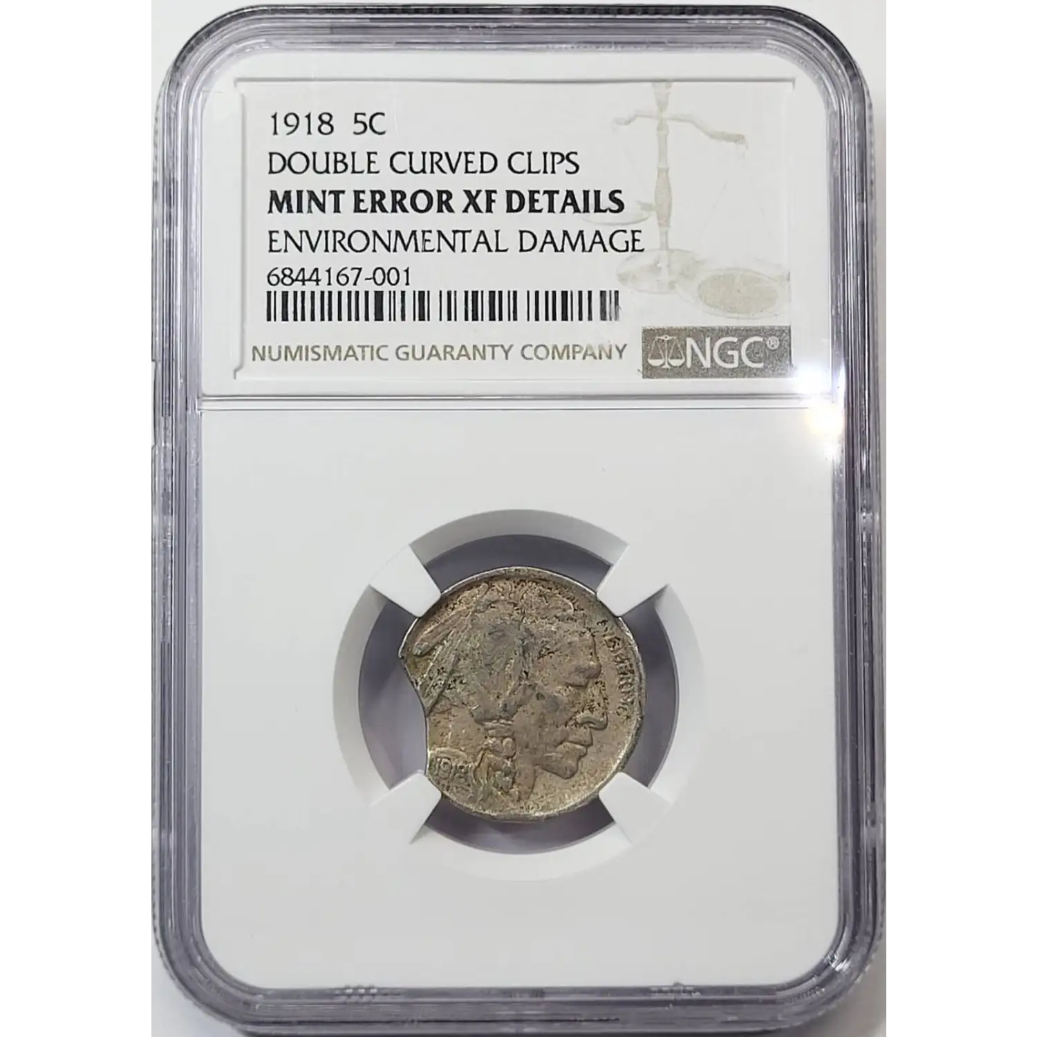 1918 Buffalo Nickel NGC MINT-ERROR-XF-DETAILS Double Curved Clips Environmental Damage