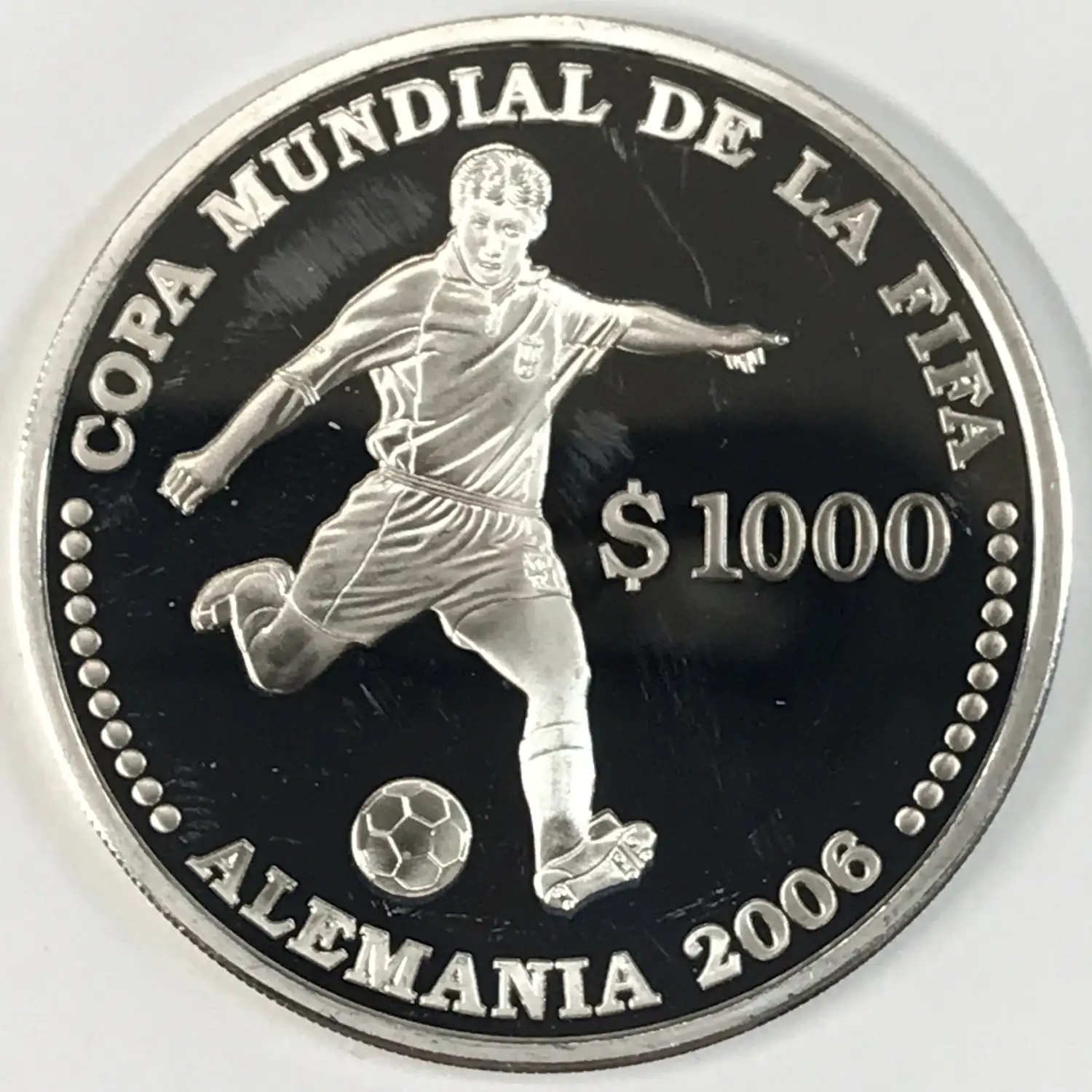 2003 Proof URUGUAY Silver 1000 PESOS URUGUAYOS - Fifa 2006 World Cup Football/Soccer - Germany - KM#122 - 27 g, .925 fine, 0.803 troy oz Adjusted Silver Weight (ASW) - some fingerprint touchmarks