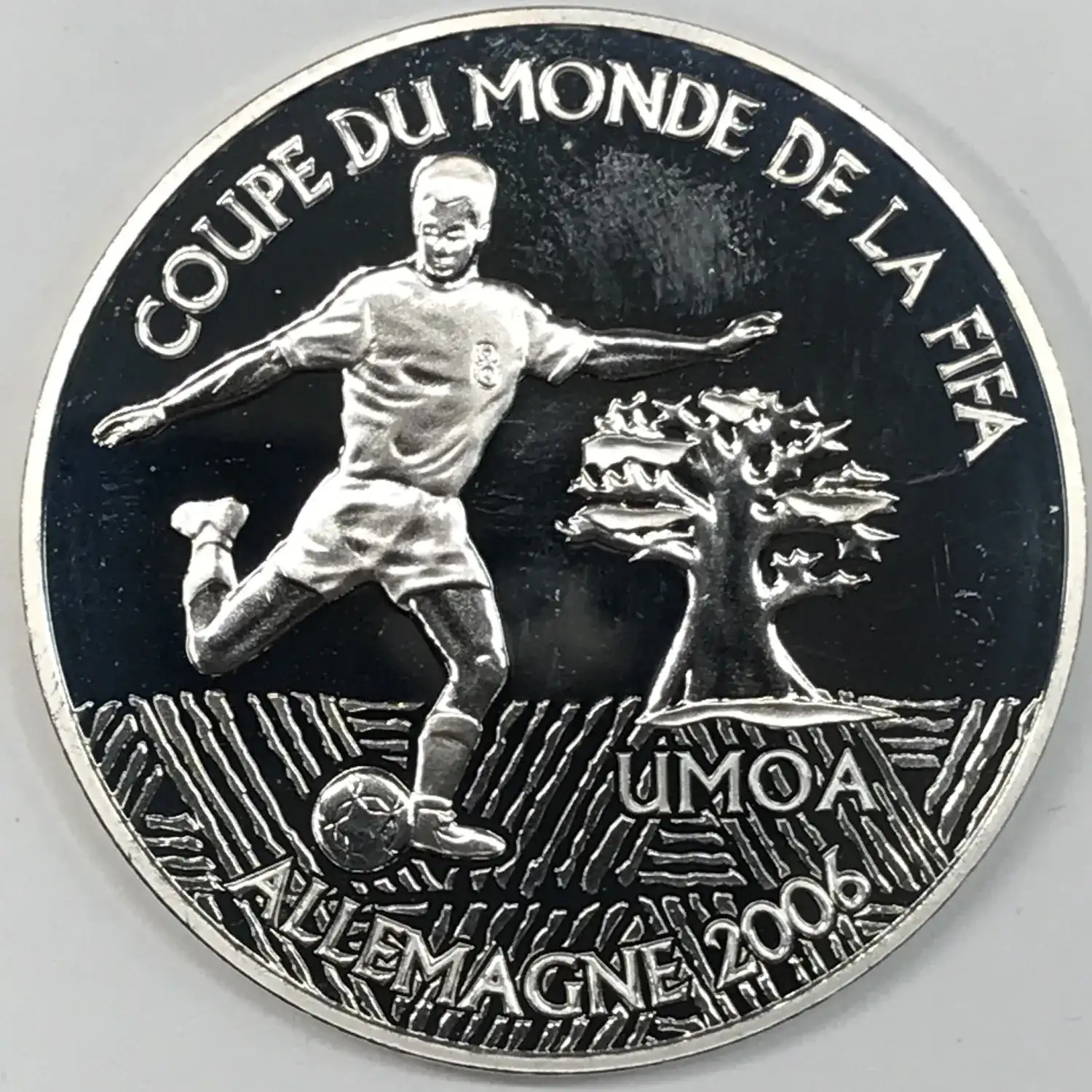 2004 Proof West African States Silver 1000 Francs - Fifa 2006 World Cup Football/Soccer - Germany - KM#17 - 22.2 g, .900 fine, 0.642 troy oz Adjusted Silver Weight (ASW) - some fingerprint touchmarks