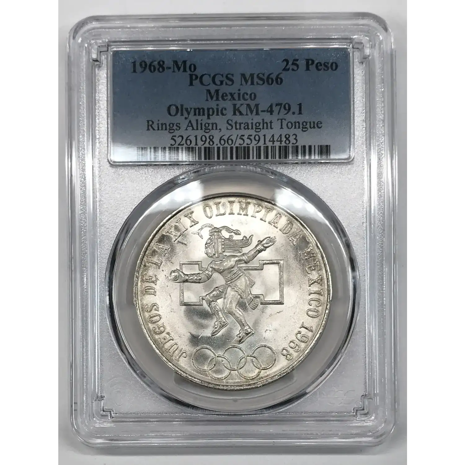 1968-Mo Mexico Silver 25 Pesos PCGS MS-66 - Olympic Type 1 (Rings Align, Straight Tongue) KM-479.1