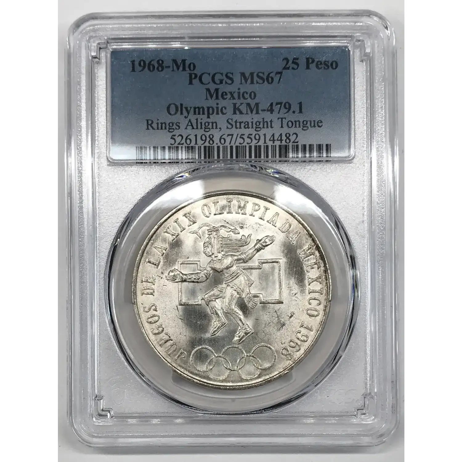 1968-Mo Mexico Silver 25 Pesos PCGS MS-67 - Olympic Type 1 (Rings Align, Straight Tongue) KM-479.1