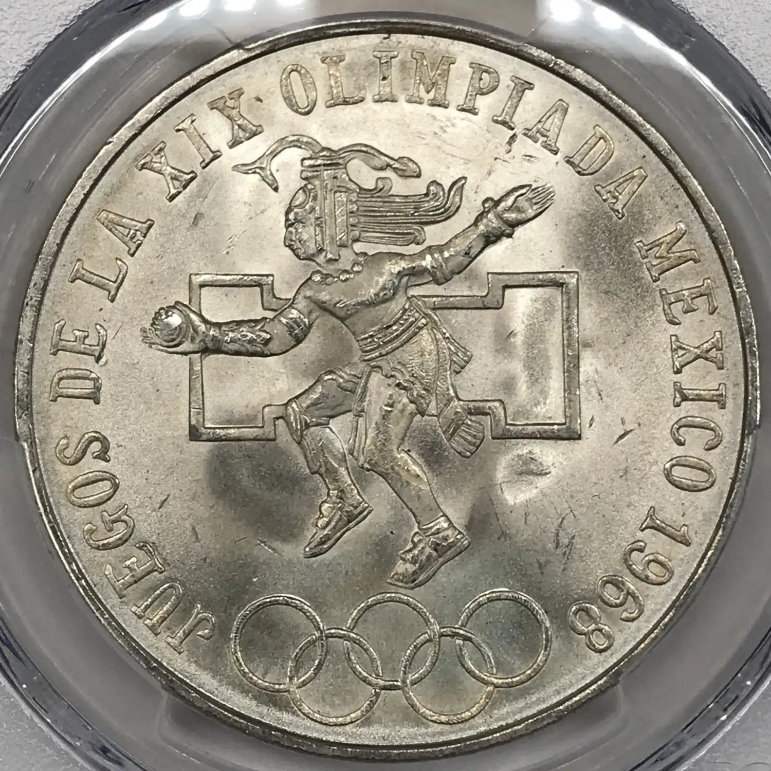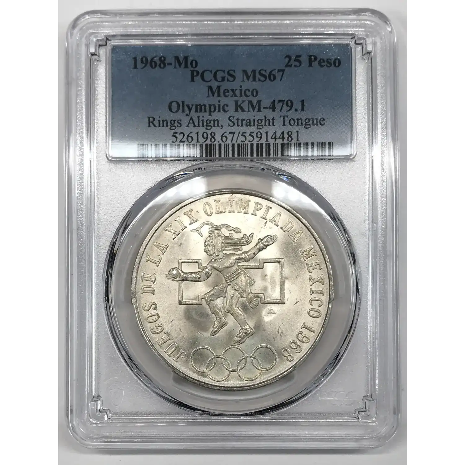 1968-Mo Mexico Silver 25 Pesos PCGS MS-67 - Olympic Type 1 (Rings Align, Straight Tongue) KM-479.1
