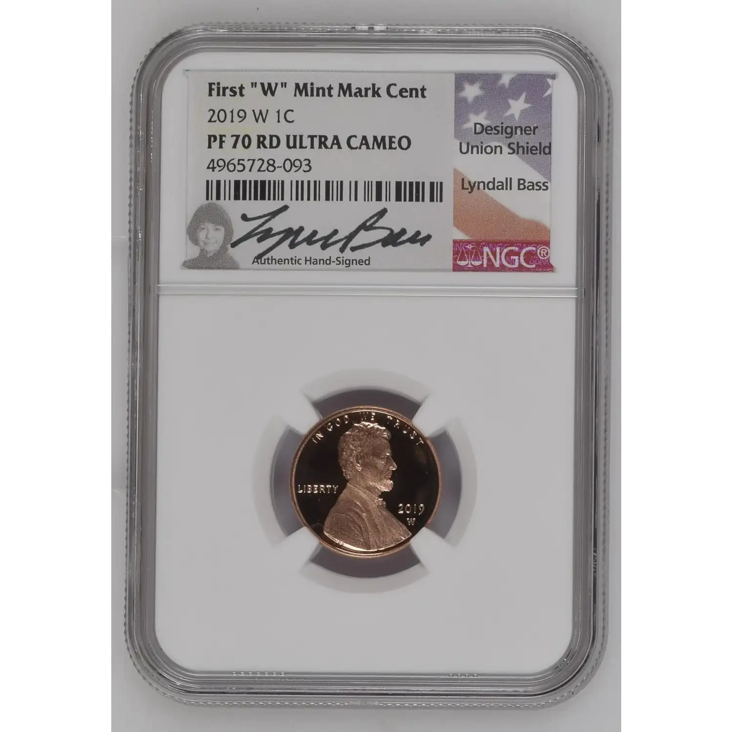 2019-W Proof Lincoln Shield Cent NGC PF-70 RD ULTRA CAMEO - Lyndall Bass (Union Shield Reverse Designer) Signature Label - First "W" Mint Mark Cent