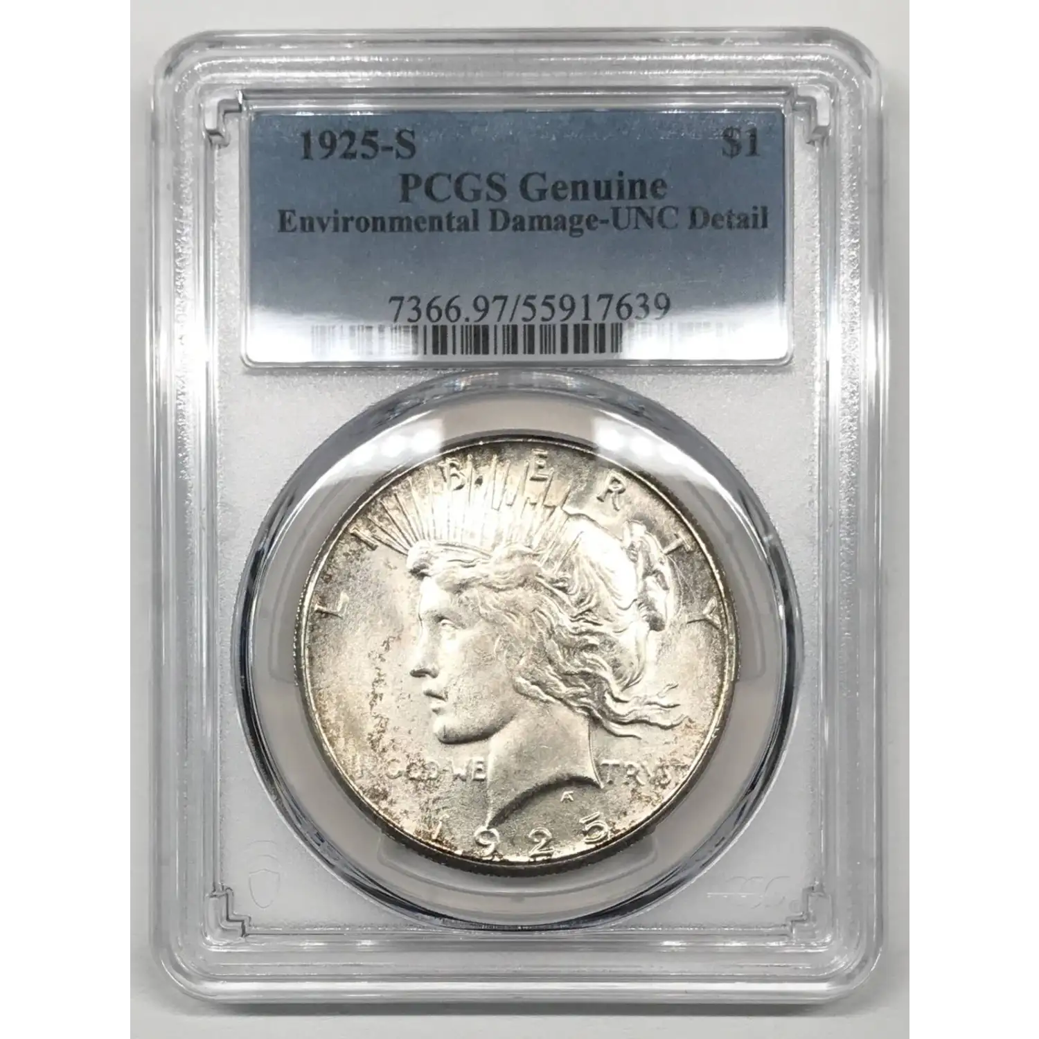 1925 S Peace Silver Dollar PCGS UNC Details (environmental damage) - nice coin despite details grade, some heavy toning / residue visible at obtuse angles, especially reverse