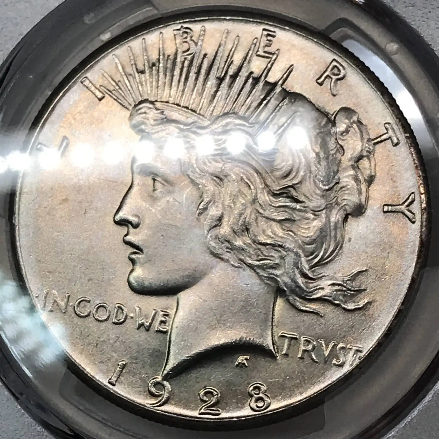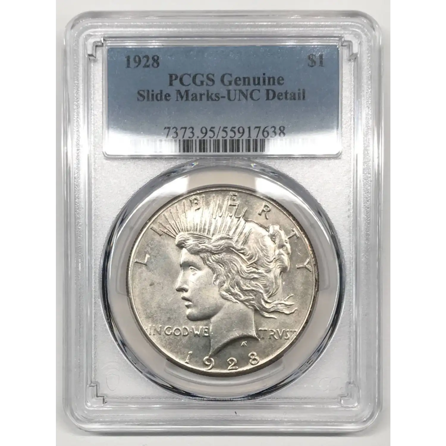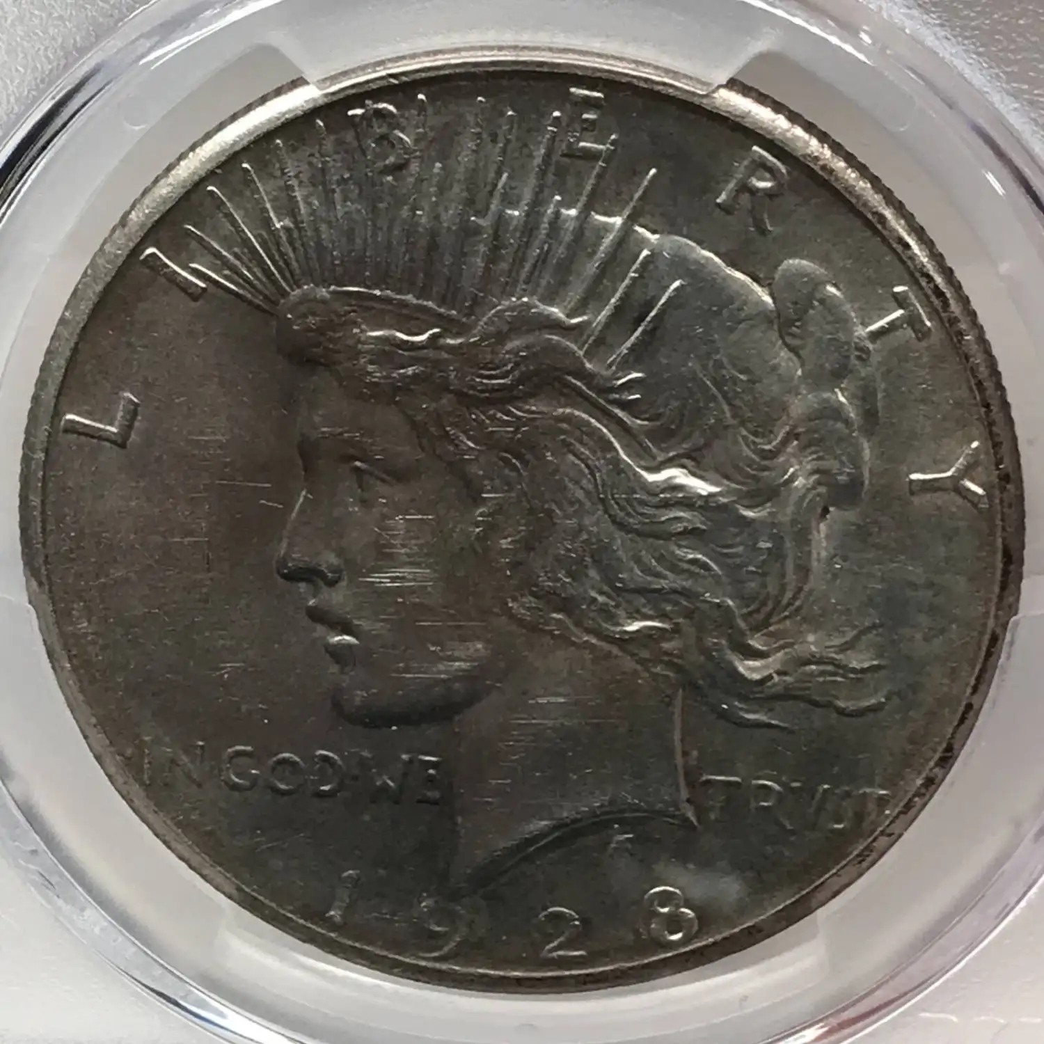 1928 P Peace Silver Dollar PCGS UNC Details (slide marks) - nice coin despite details grade, slide marks visible at some angles