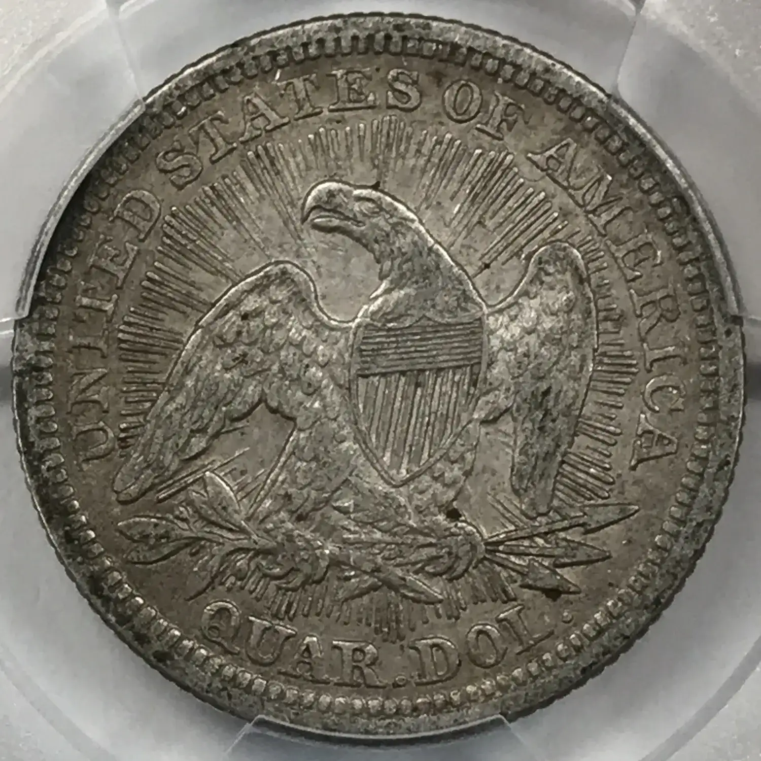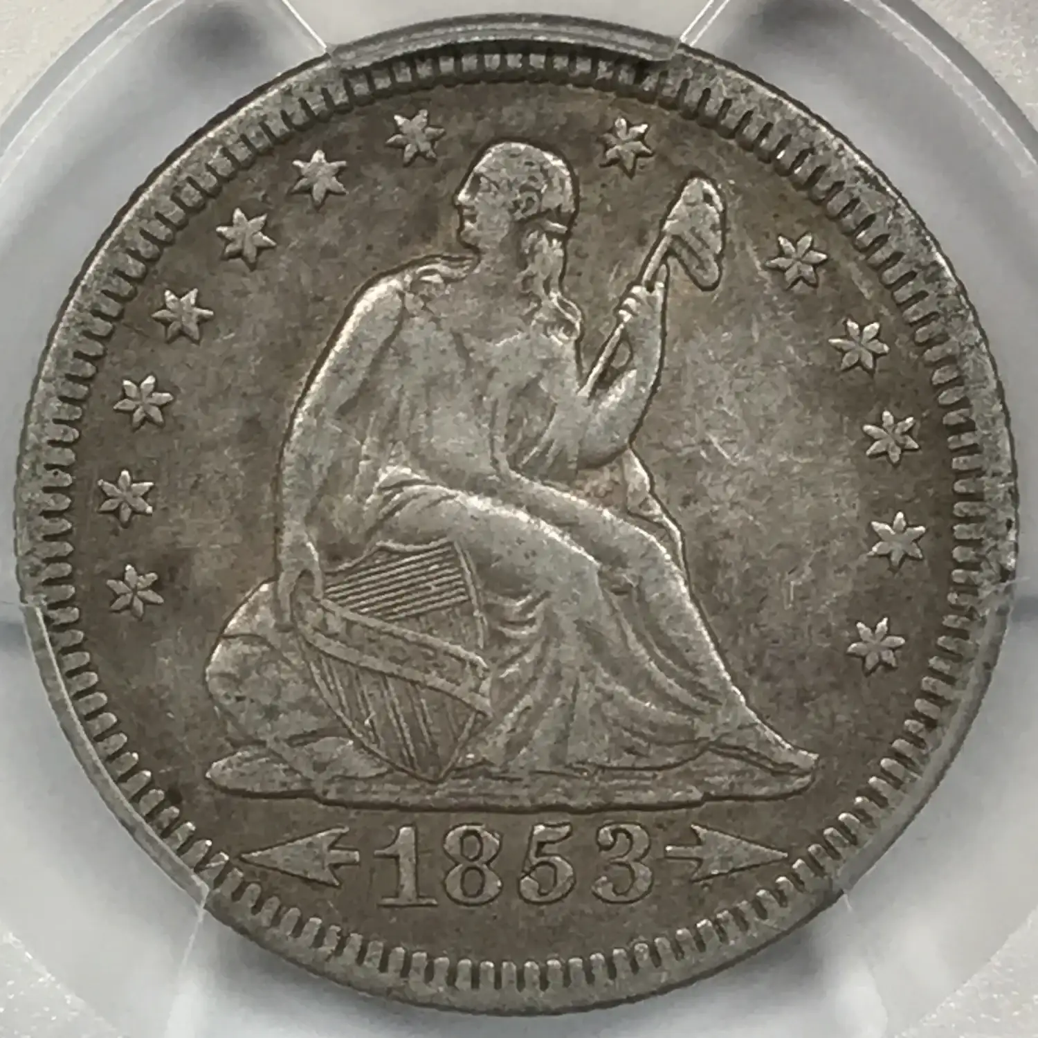 1853 P Arrows and Rays Seated Liberty Quarter PCGS XF Details (cleaned) - some lines/brightness visible in right field at certain angles - crackout out of ICG XF40
