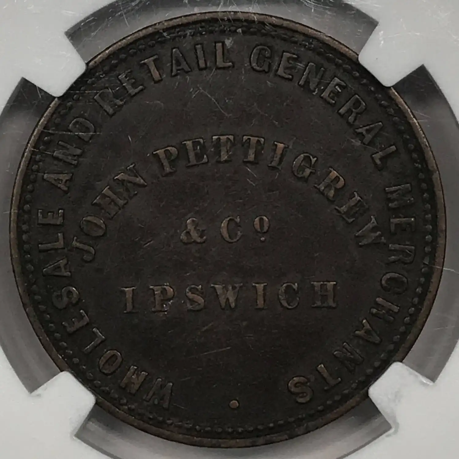 1865 JOHN PETTIGREW IPSWICH WHOLESALE & RETAIL GENERAL MERCHANTS AUSTRALIA PENNY/Token NGC XF-45 BN