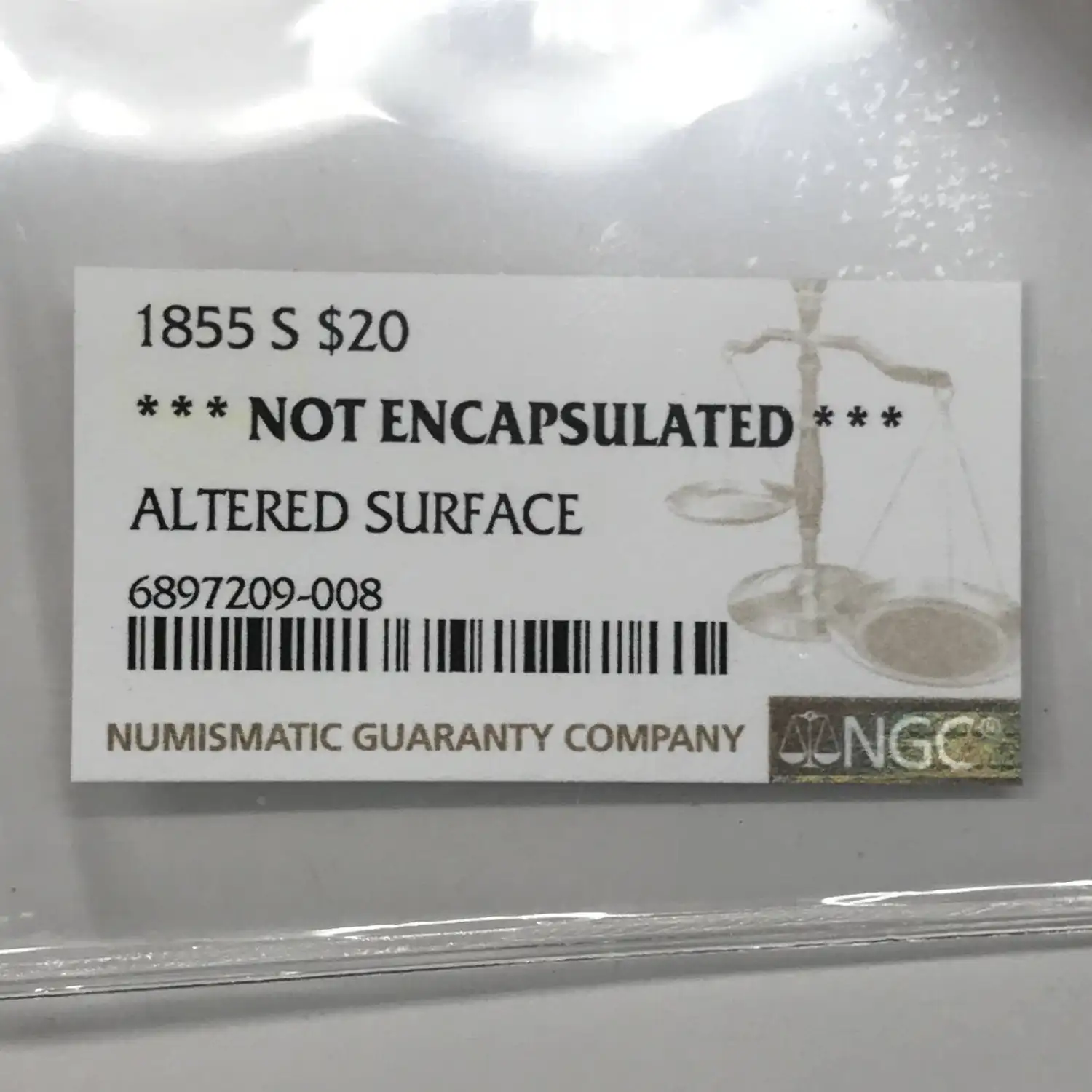 1855 S Liberty Head $20 Gold Double Eagle - NGC would not encapsulate due to "altered surface"