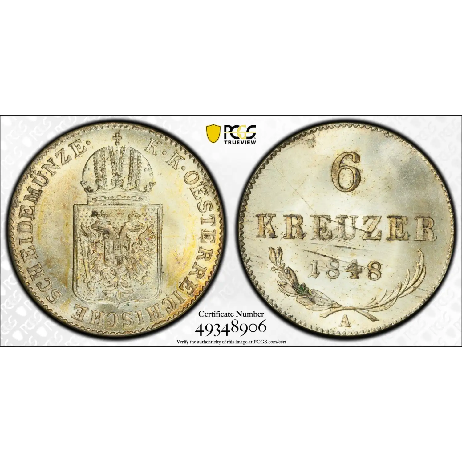 1848-A Austria Silver 6 KREUZER PCGS MS-63 - KM#2199
