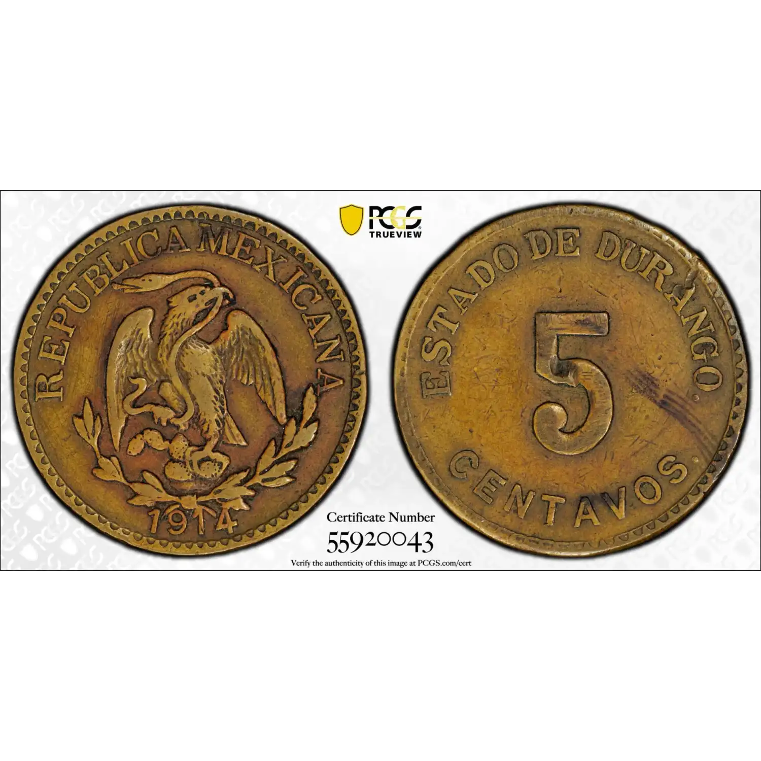 1914 MEXICO-REVOLUTIONARY Brass 5 CENTAVOS PCGS Genuine - XF Details (98 - Damage) Durango