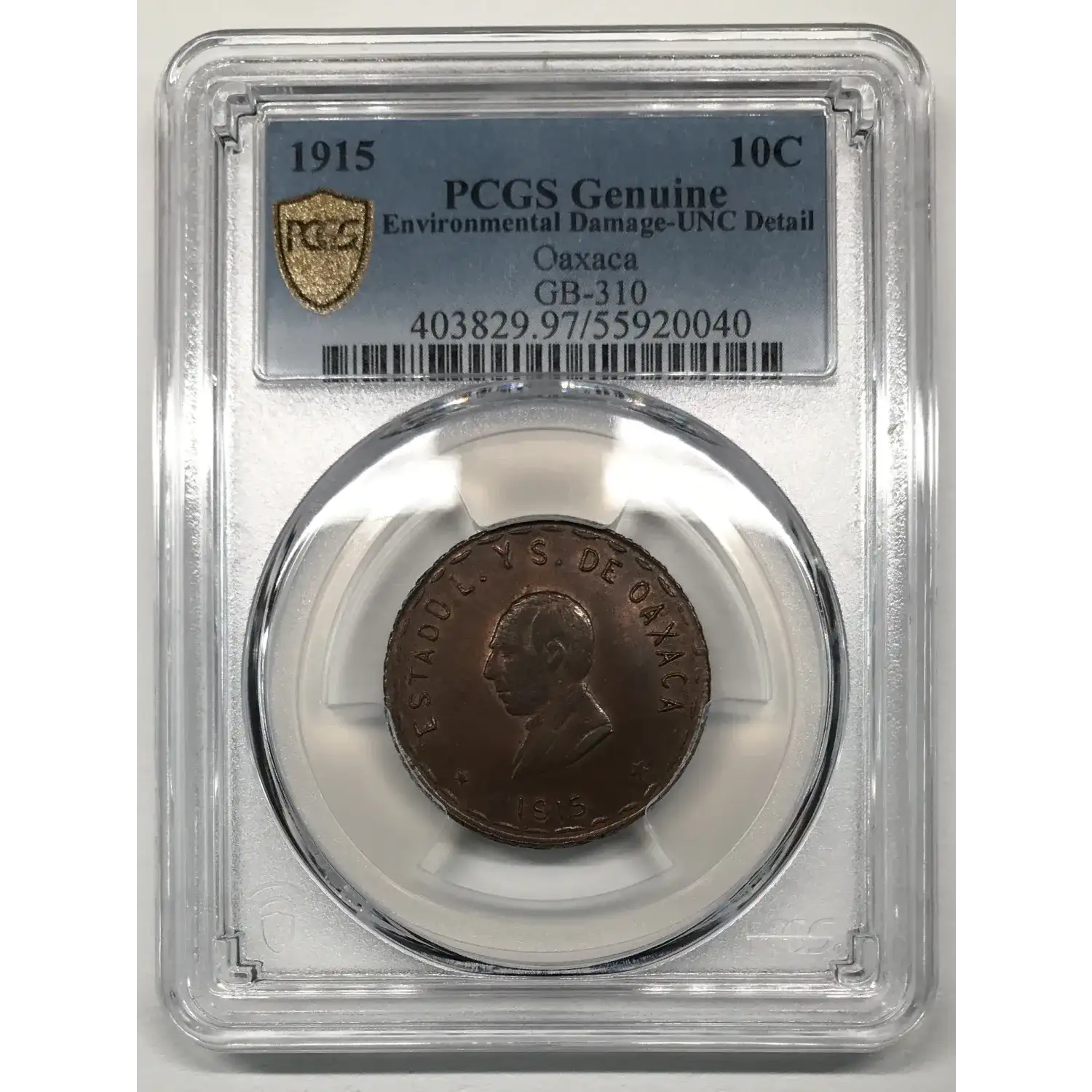 1915 MEXICO-REVOLUTIONARY Copper 10 CENTAVOS PCGS Genuine - UNC Details (97 - Environmental Damage) BN Oaxaca GB-310