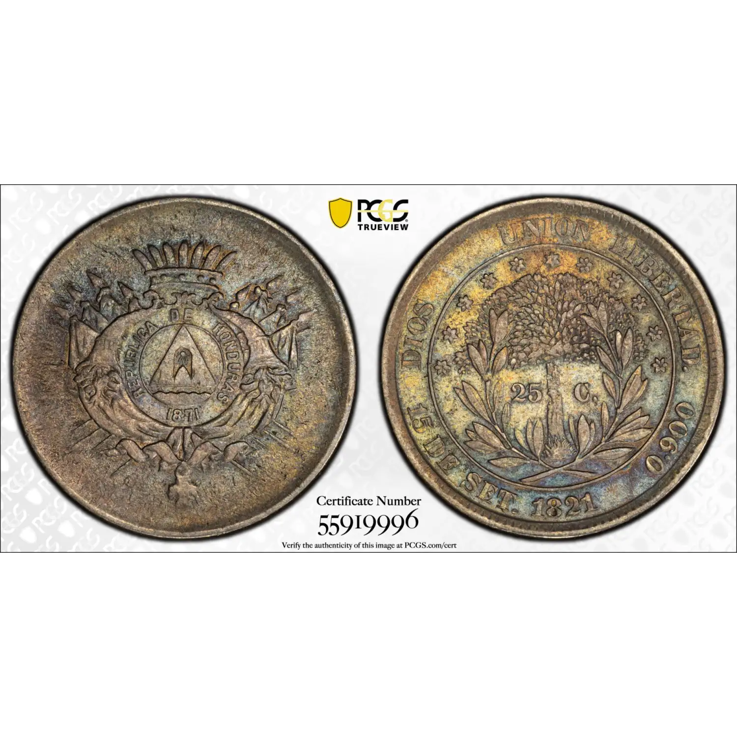 1871 Honduras Silver 25 CENTAVOS PCGS XF-45