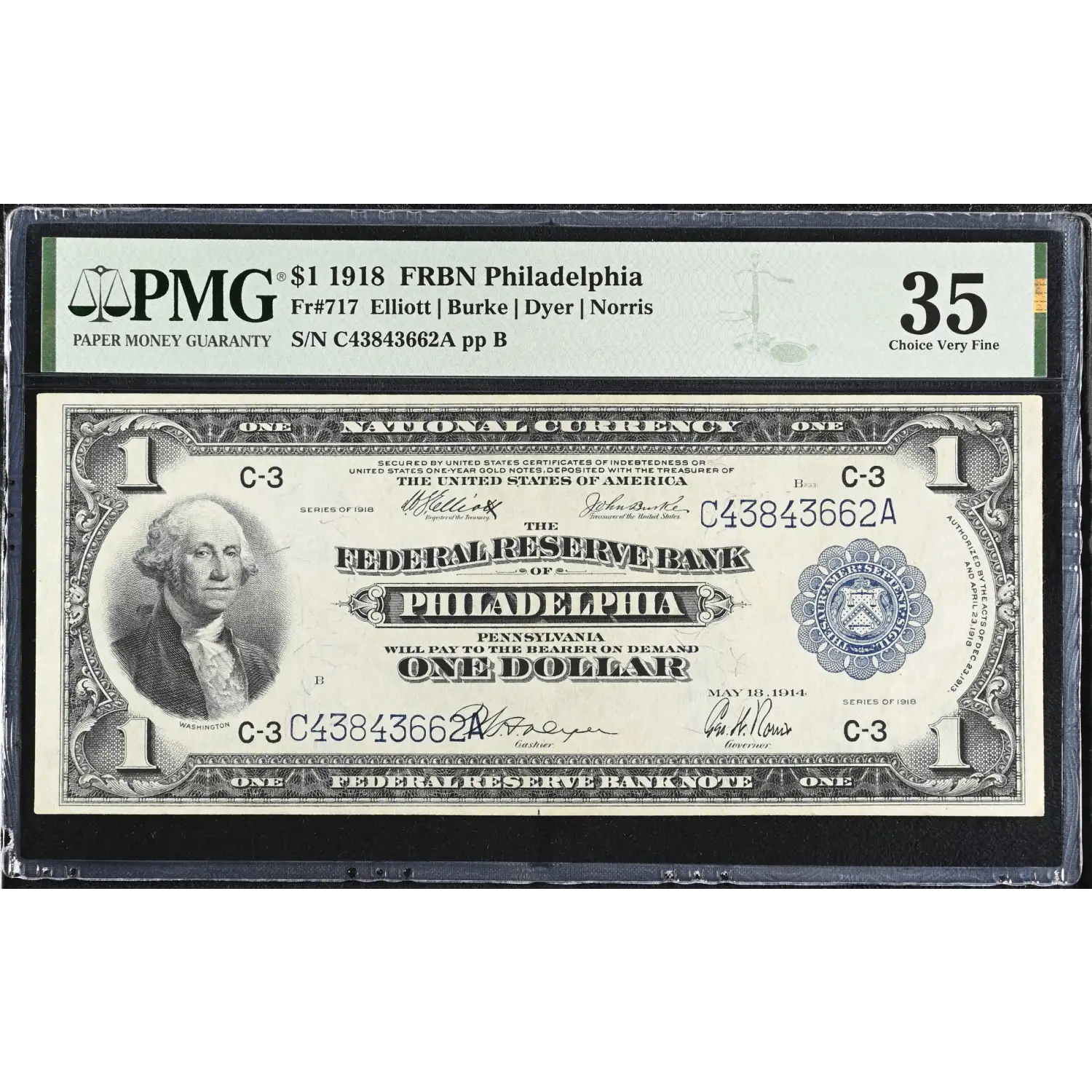 1918 $1 Federal Reserve Bank Note (FRBN) National Currency Philadelphia FR#717 PMG VF 35