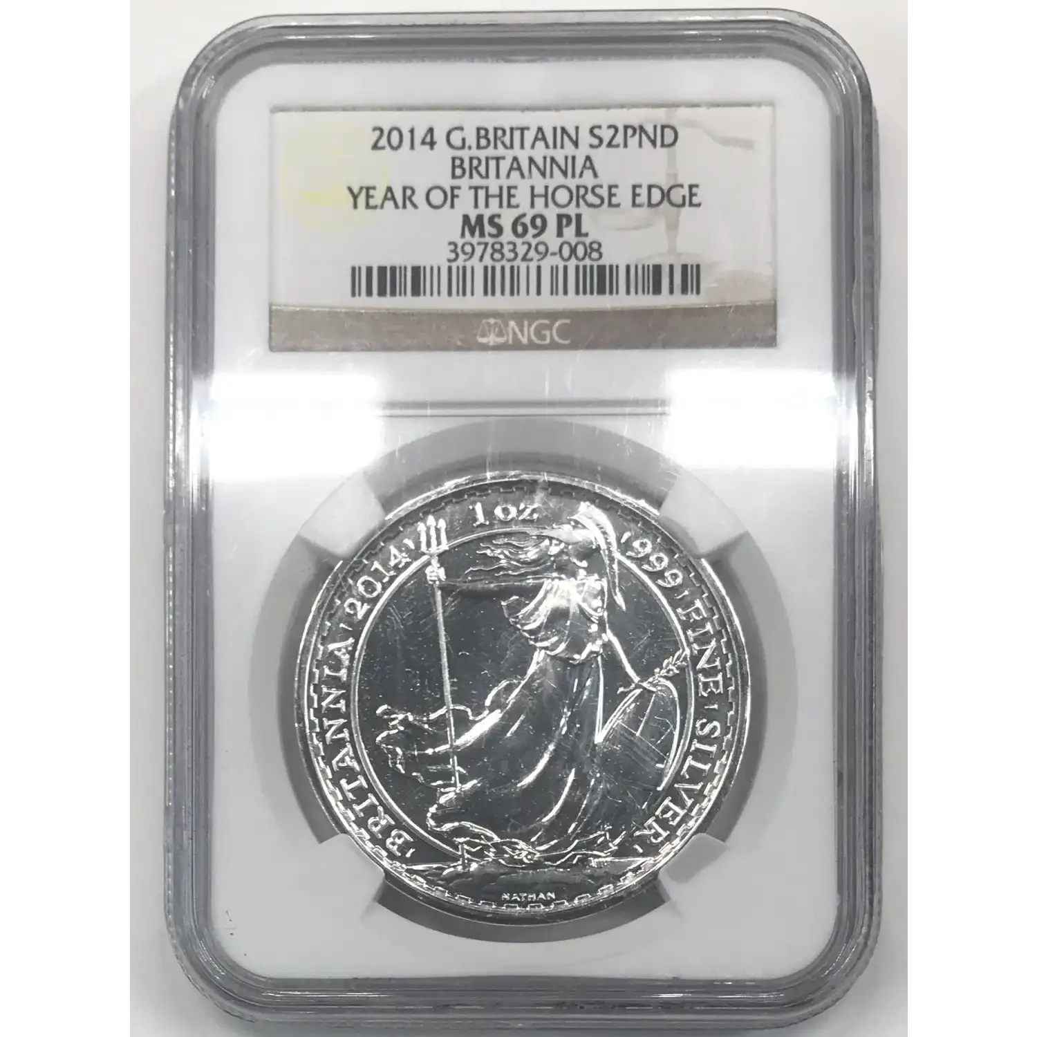 2014 GREAT BRITAIN YEAR OF THE HORSE EDGE 1 oz Silver BRITANNIA 2 POUNDS NGC MS-69 PL