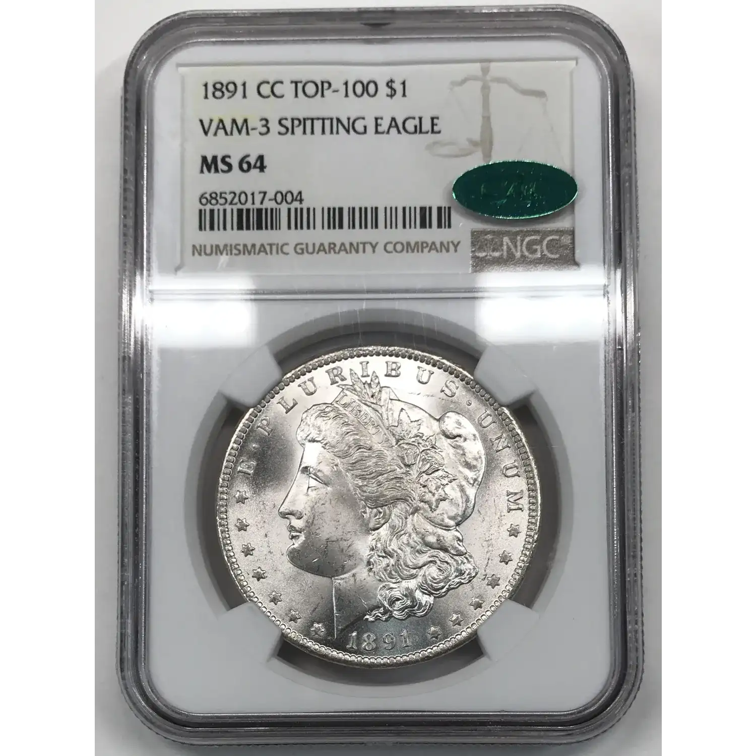 1891-CC Morgan Silver Dollar NGC MS-64 CAC - TOP 100 VAM-3 SPITTING EAGLE