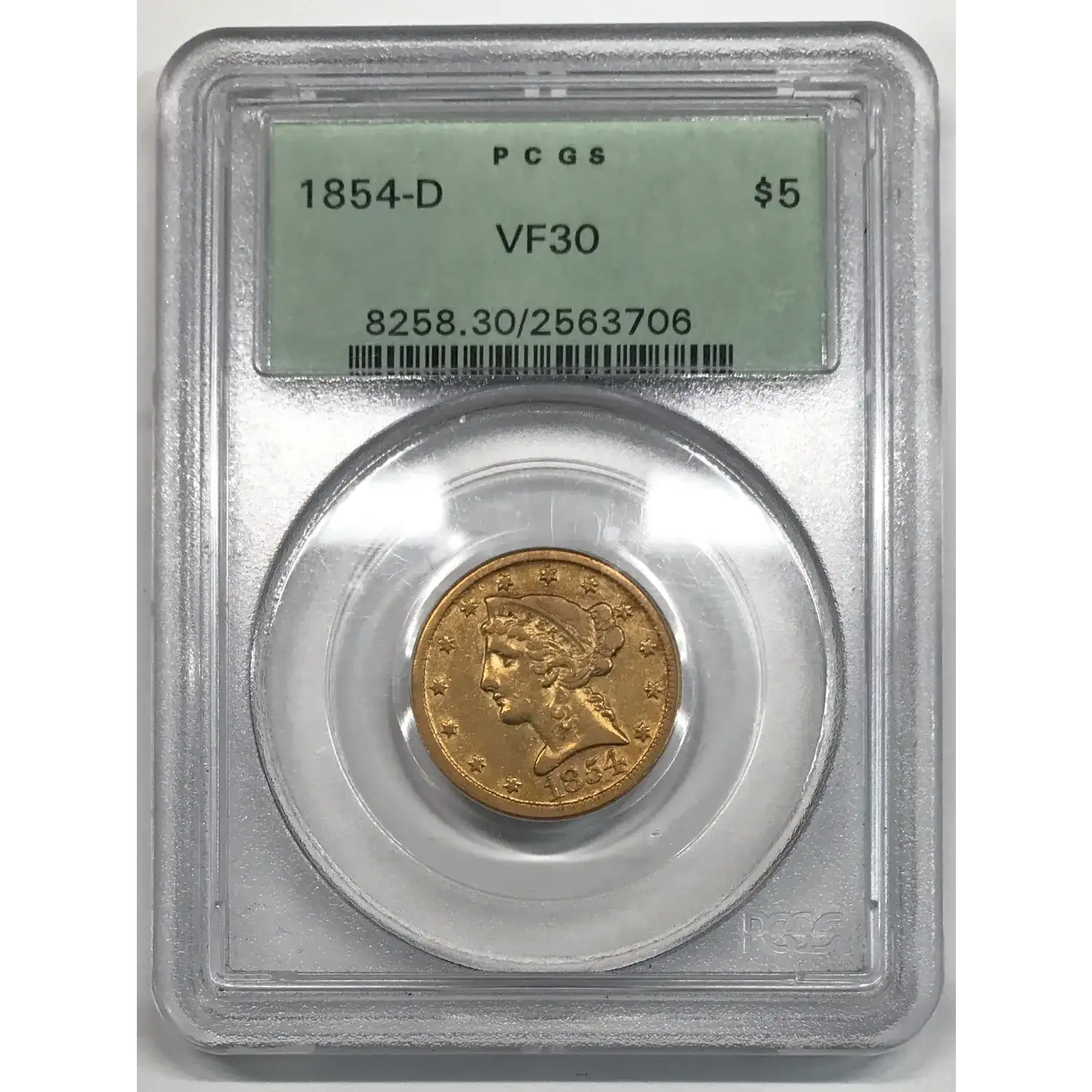1854 D Large D $5 Gold Liberty Head Half Eagle PCGS VF-30 - Gen 3.1 Old Green Holder (OGH)