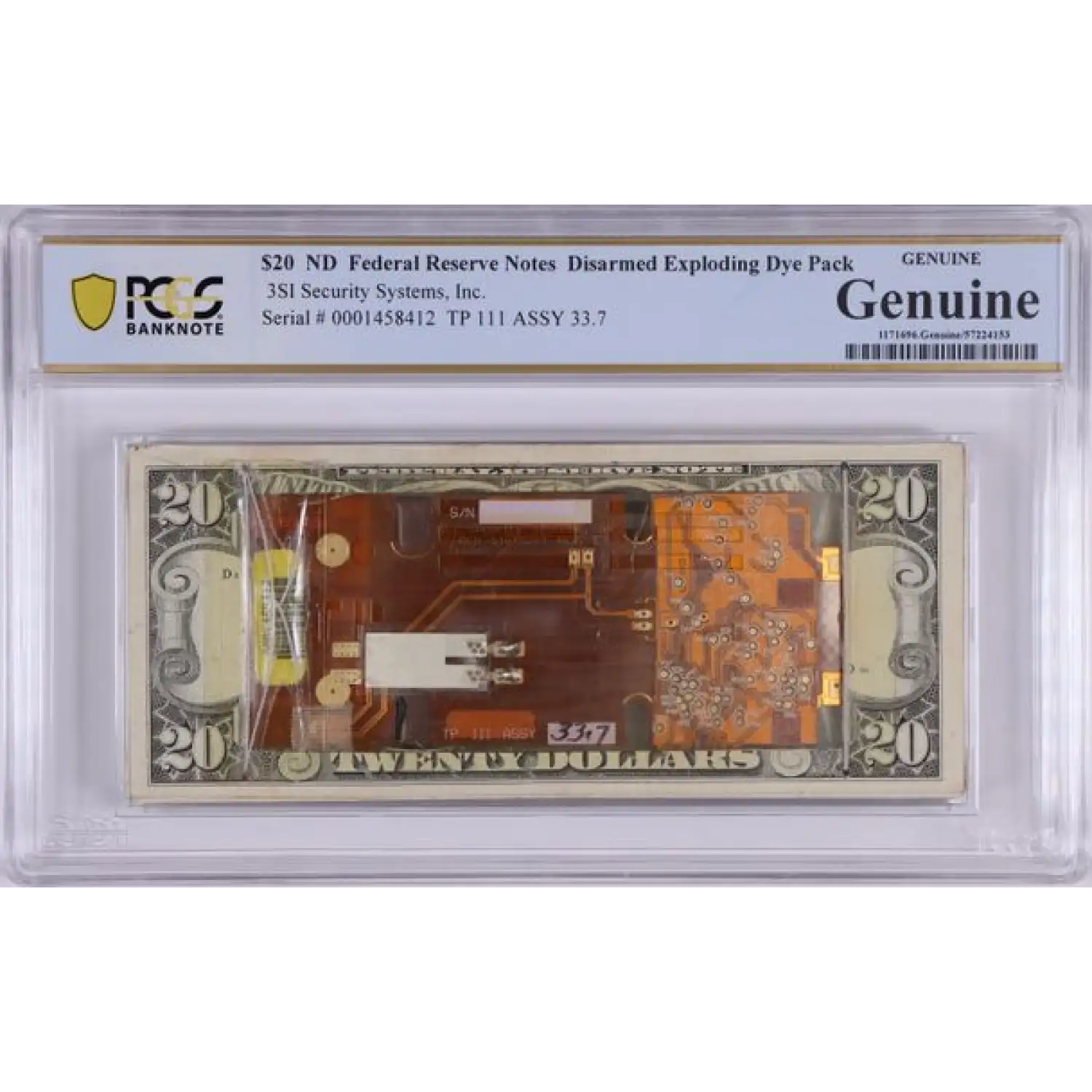 *Disarmed Exploding Dye Pack* $20 FRNs PCGS Banknote Genuine - 3SI Security Systems, Inc. - TP 111 ASSY 33.7