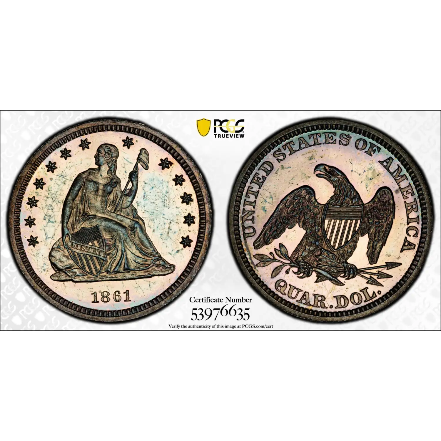 1861 Proof Seated Liberty Quarter PCGS PR-64 - Toned