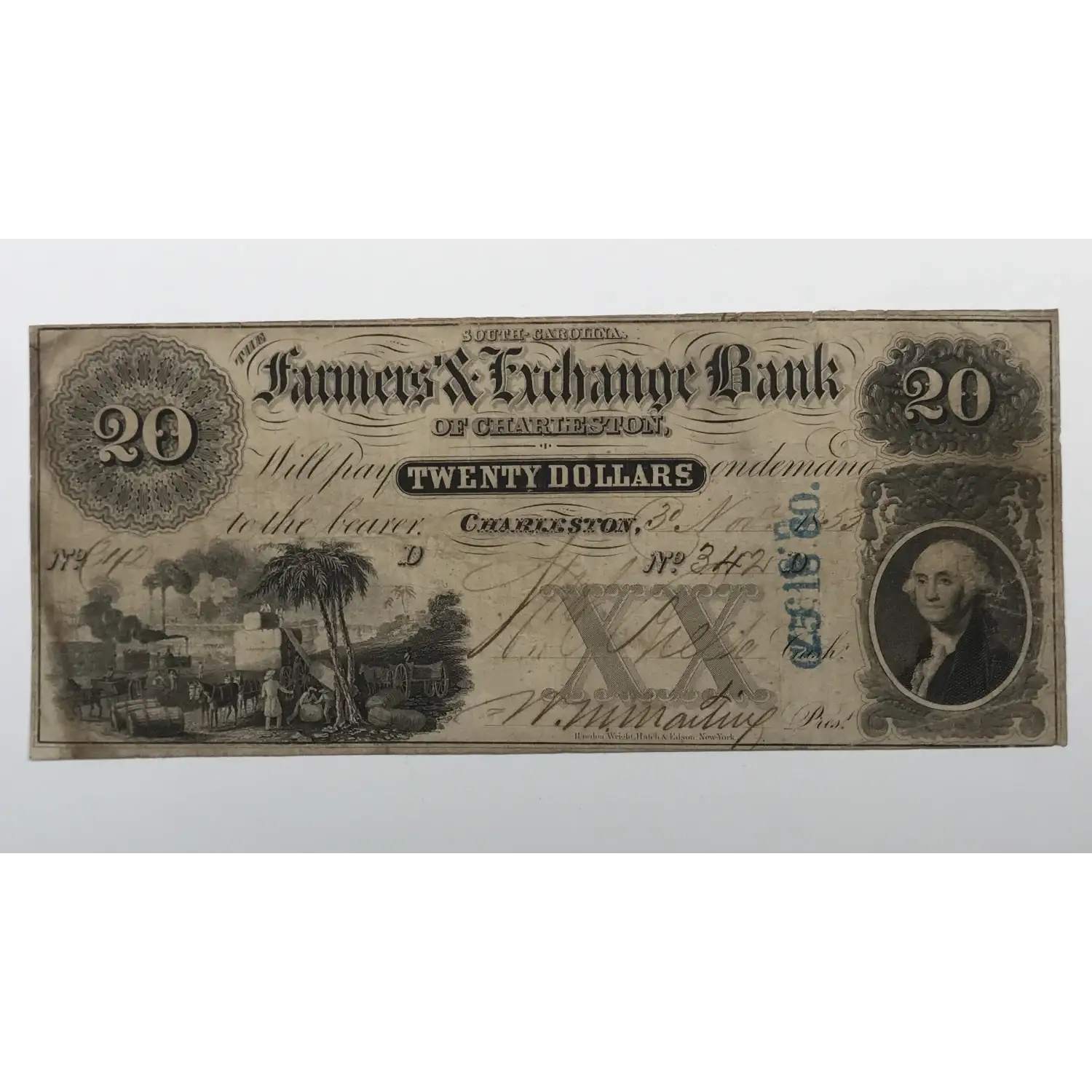 1853 $20 The Farmers' & Exchange Bank Charleston South Carolina Obsolete Currency