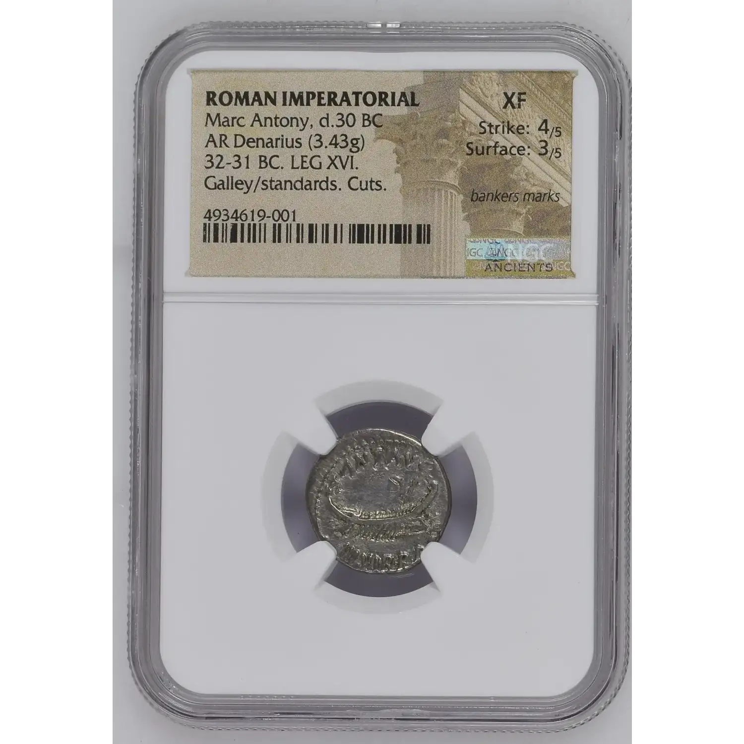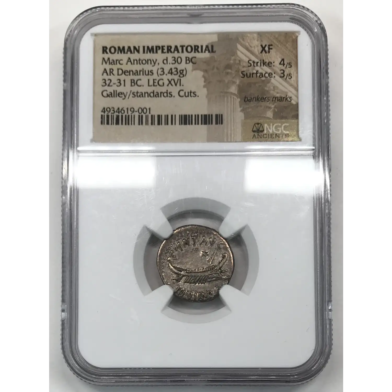Roman Imperatorial Marc Antony d.30 BC (died) AR Denarius NGC Ancients XF 4 3 (bankers mark)