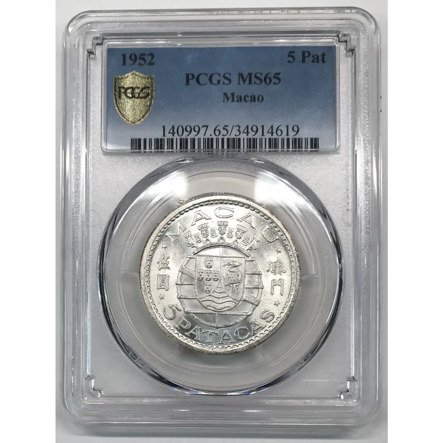 1952 MACAU Silver 5 PATACAS PCGS MS-65 KM-5